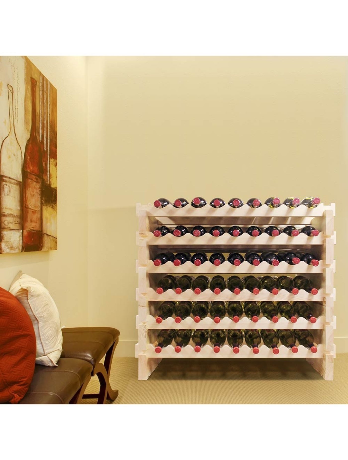A: It’s a modular wooden wine rack with a natural finish, designed to store up to 108 bottles in a sturdy, space-efficient design.