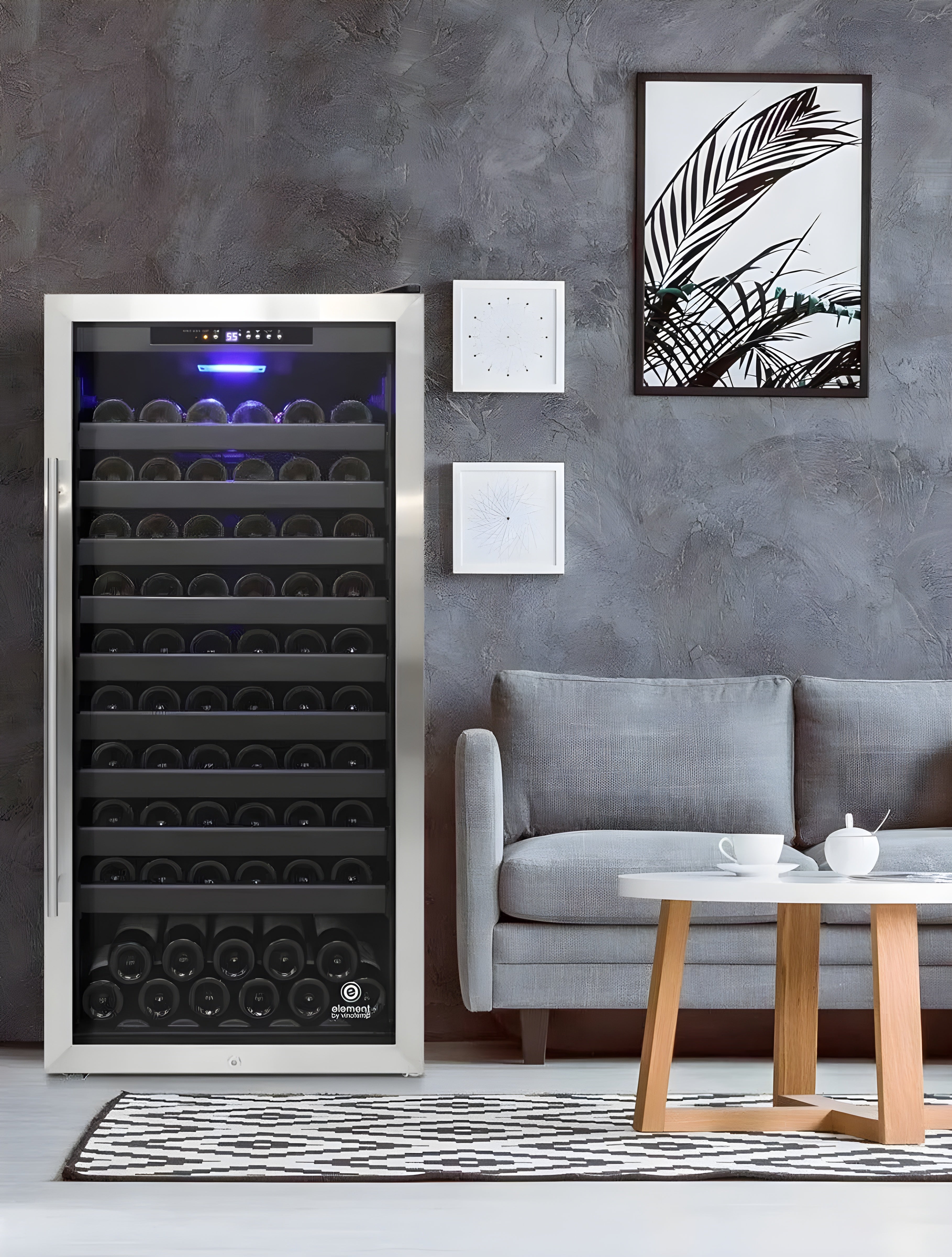 For sleek, stylish and sophisticated wine storage for your prized collection, the 114-Bottle Freestanding Wine Cooler by Vinotemp is the perfect solution. This single-zone wine cooler allows you to set the right temperature to provide optimum condition for up to 114 bottles of your wine collection. A conveniently located digital control panel makes setting the ideal temperature a simple task. Contemporary styling includes a black body and a dual-pane glass door. Vinotemp’s Ouzo wine racks with black lip cradles your collection behind a glass door with stainless steel frame. Nine sliding shelves and a bulk storage section provide easy access to your storage space. The interior LED lighting creates a gorgeous display and makes it easy to find your favorite bottles. Stainless steel frame and door lock add to the style and functionality of this cooler. This cooler is designed for freestanding installation and best suited for medium sized wine collection.
