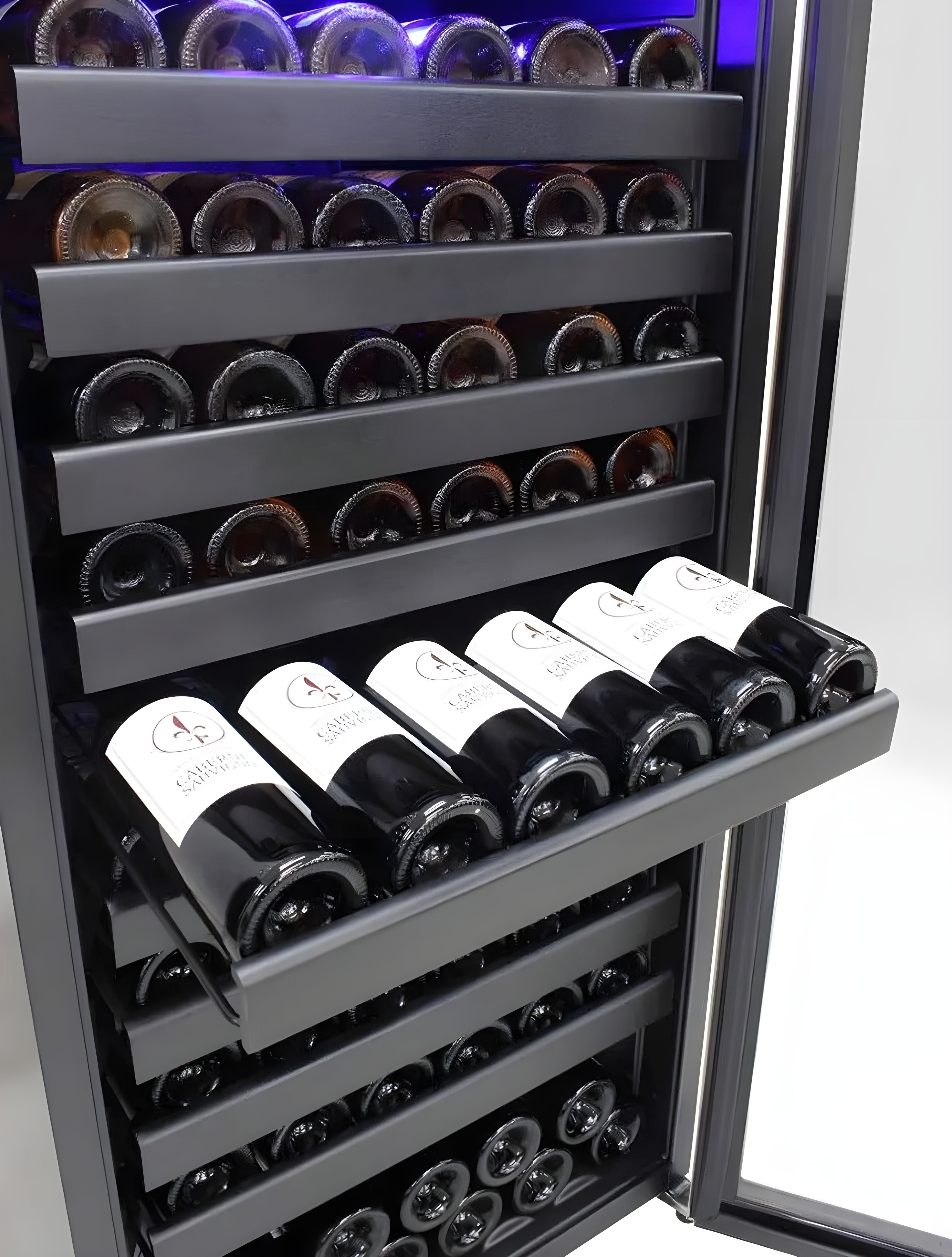 • 9 full-size, sliding Ouzo style wine racks with black lip