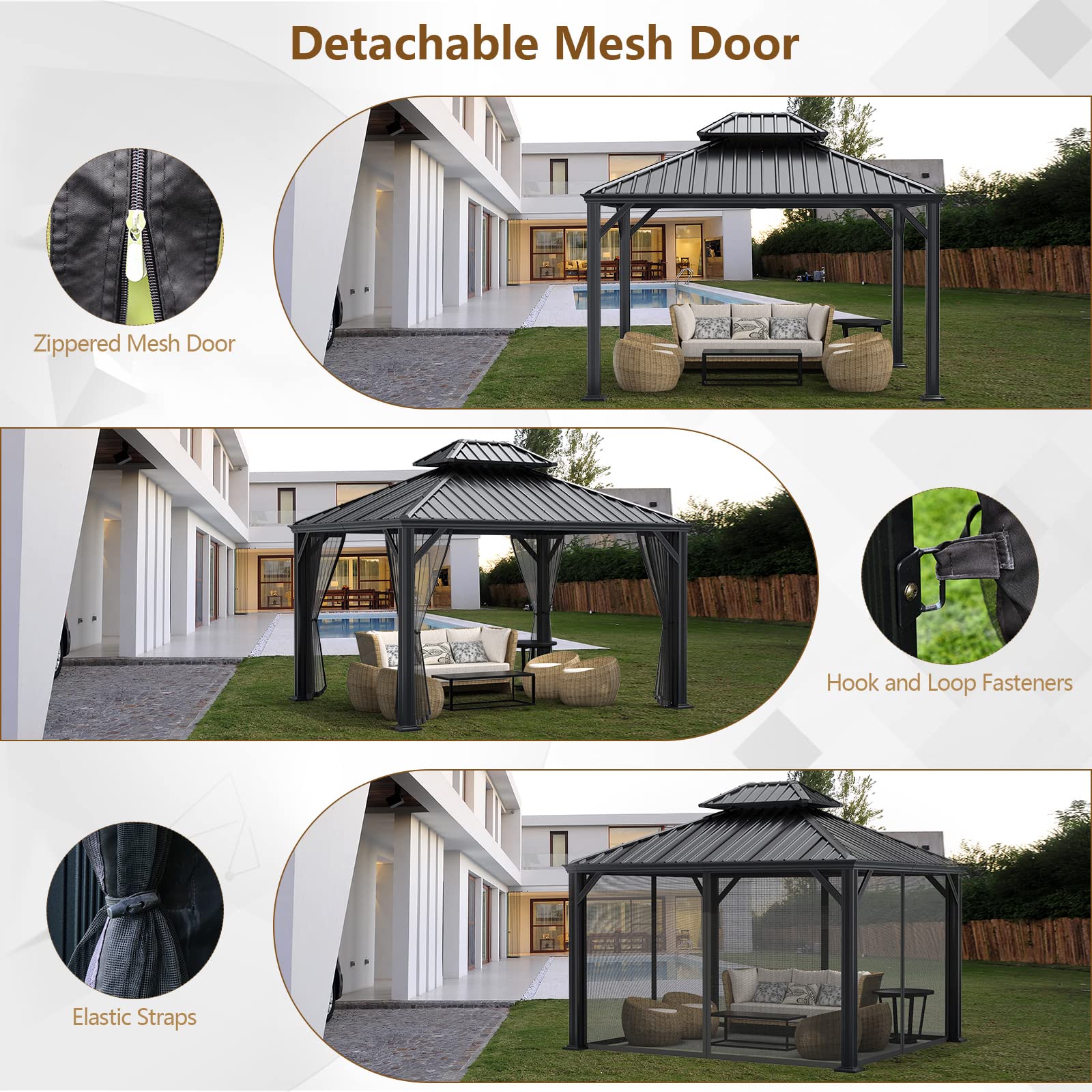 If you want to build an extra shade for relaxing in your backyard, this hardtop gazebo will be a nice choice! Compared with a common canopy made of fabric, our hardtop sun shelter made of heavy-duty galvanized steel is more sturdy and reliable in an outdoor environment. It performs well in rustproof, wind-resistance, and rainproof abilities. The 2-tier roof could load snow up to 3600 lbs in cold winter. The air vent can not only increase its wind resistance but also facilitate heat dissipation. In addition, you can hang a fan or lamp on the central hook to improve the degree of comfort under the canopy. It's suitable for 6-8 people in daily use.