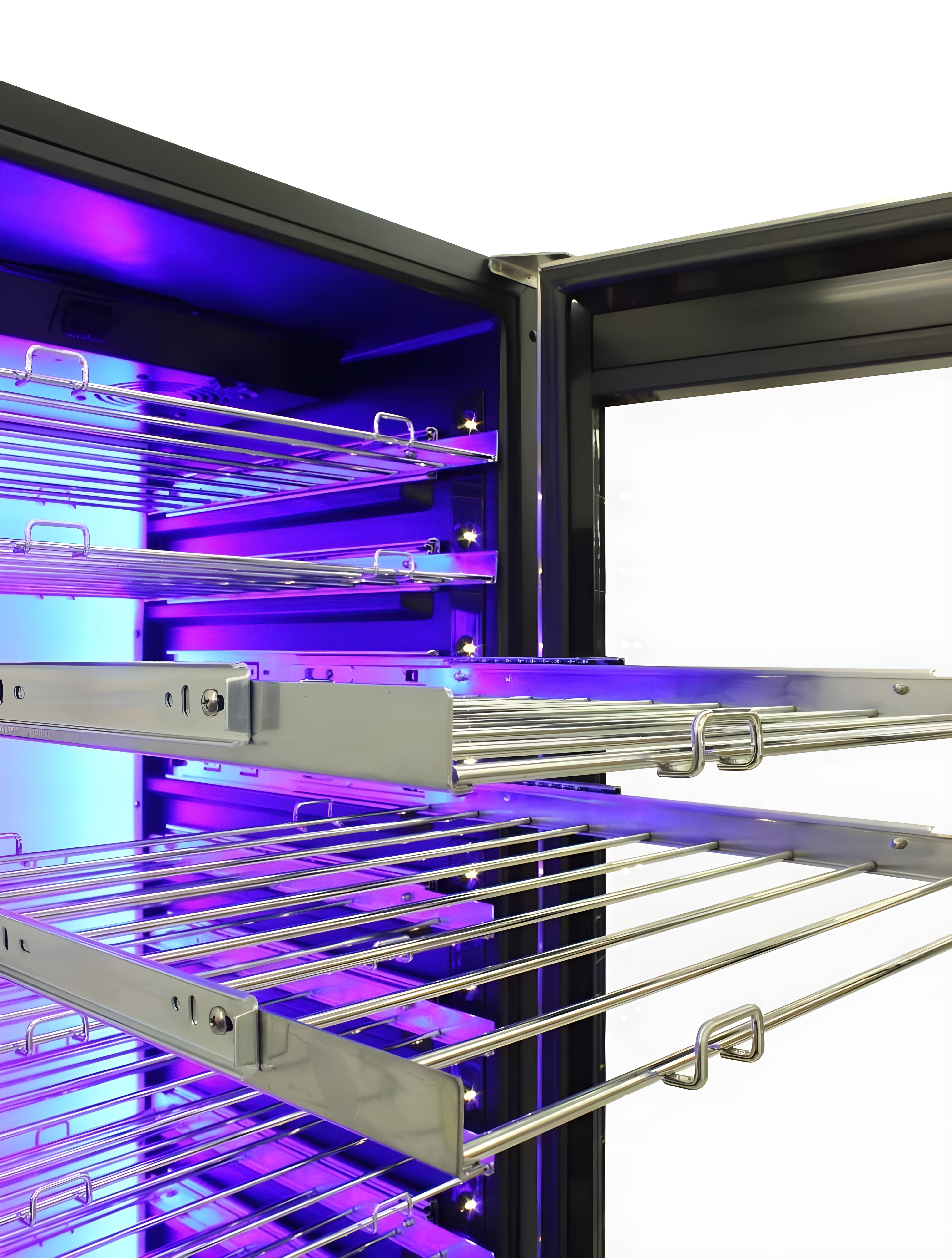 A: The UV-resistant glass door prevents light damage, while the precise compressor cooling system ensures consistent temperature control.