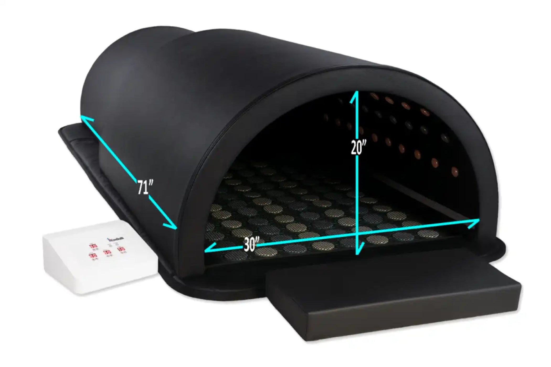 A premium portable far infrared sauna featuring a 360° dome design, therapeutic mat, and stones, offering full-body wellness therapy with near-zero EMF exposure.