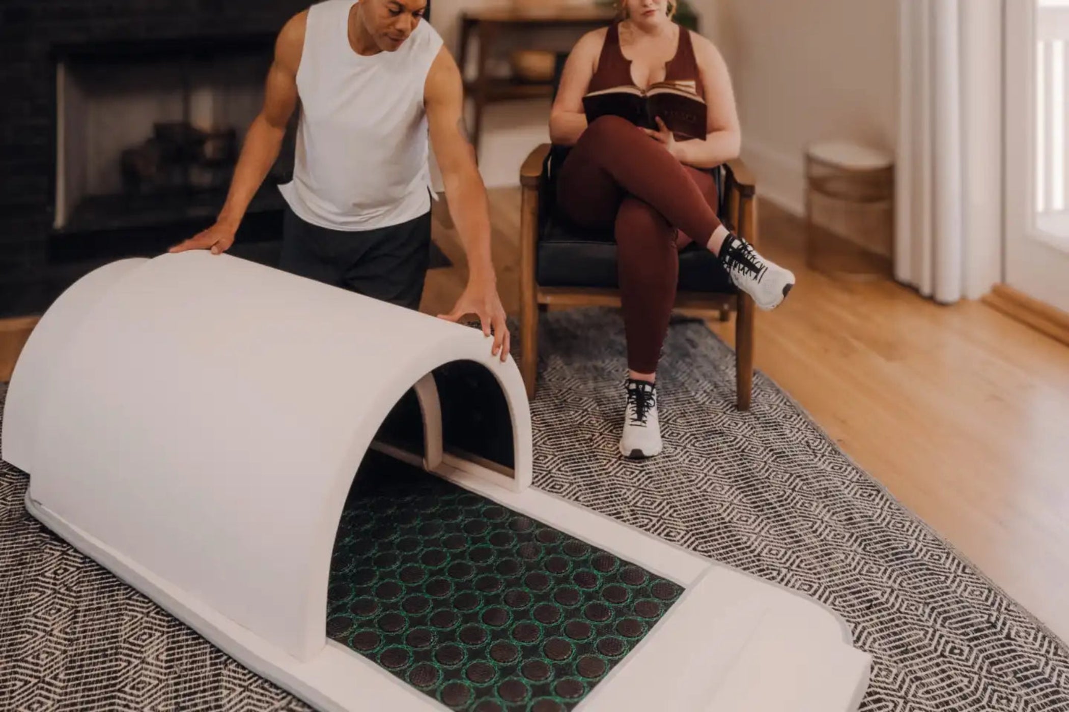 A portable far infrared sauna designed for full-body therapy with a 360° dome, therapeutic mat, and stones, offering a range of wellness benefits.