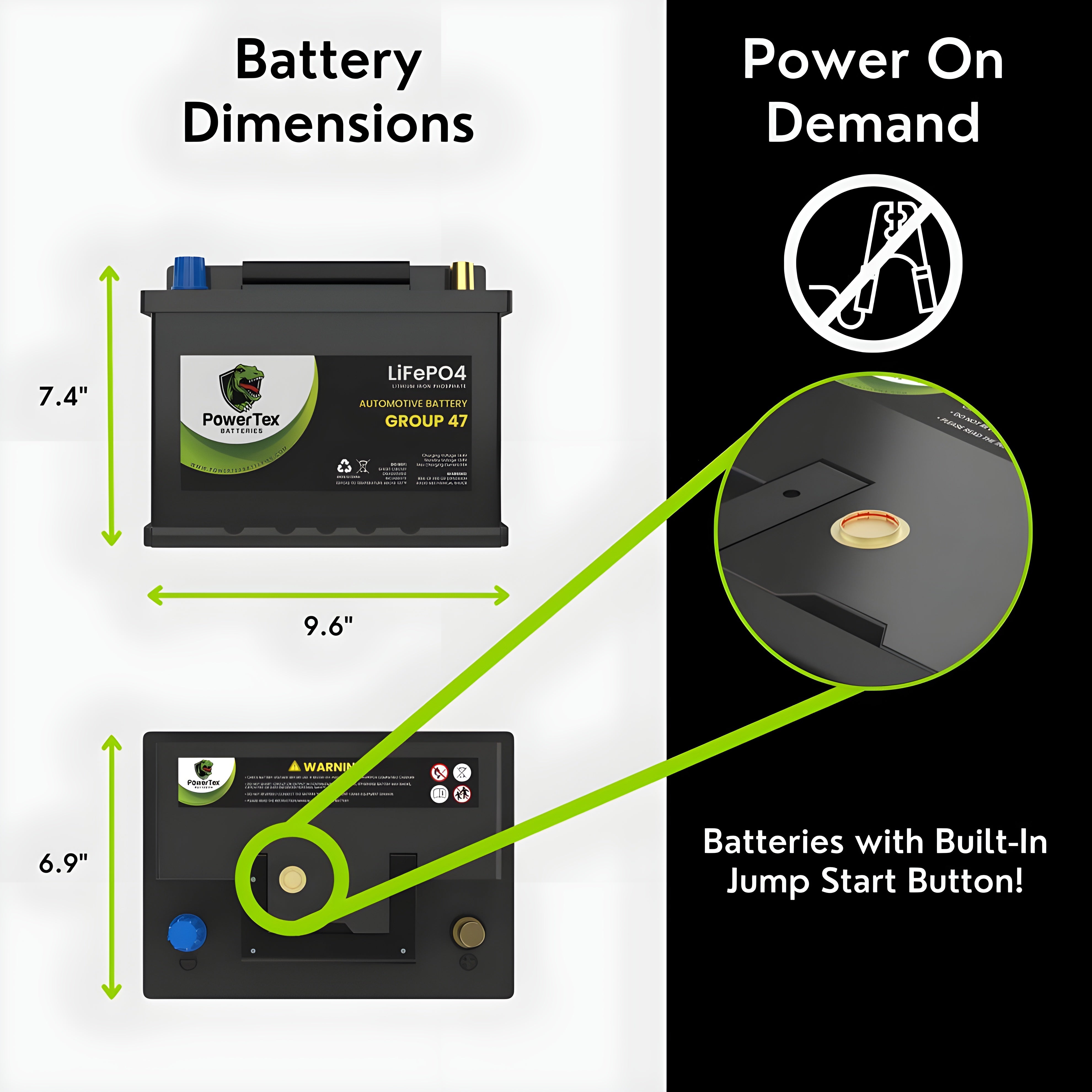 PowerTex 2022 Toyota Avalon L4 2.5LReplacement Car Battery BCI Group 47 Lithium LiFePO4 Automotive Powertex Battery - PTLG47-058