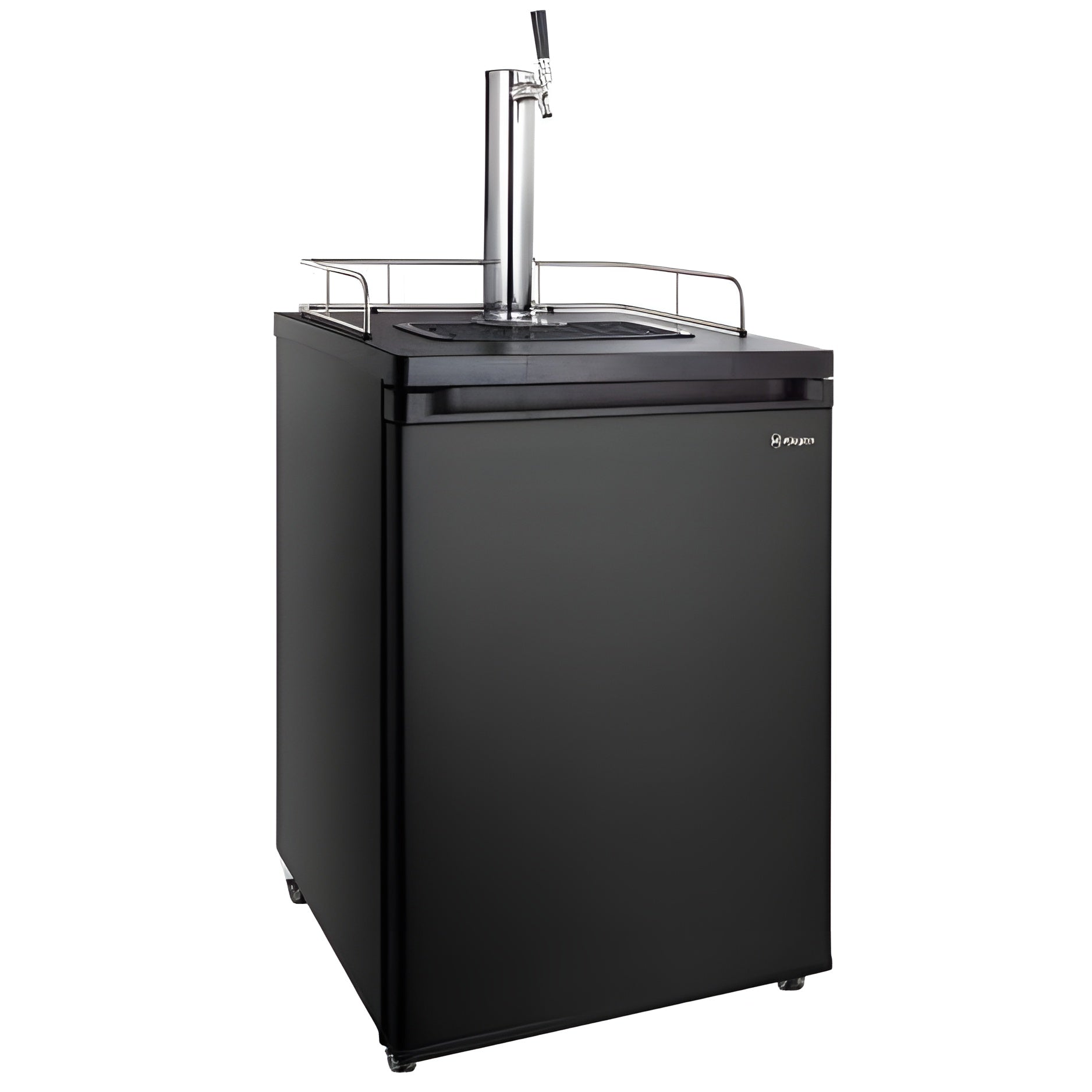 The Kegco KOM20B-1NK is designed for home use so it is quiet and energy efficient. The sleek matte black finish complements any decor and does not show fingerprints like a shiny finish might, so it requires less cleaning. The easy roll casters make moving this unit from your bar to your patio a breeze, and they lock to prevent the unit from rolling once you have it in position. The removable recessed drip tray with plastic grill can easily be taken out and cleaned in the dishwasher, while the attractive and easy-to-install chrome safety rail helps to keep mugs and glasses from sliding off. This Kombucha Cooler includes a single tap draft dispense system.
