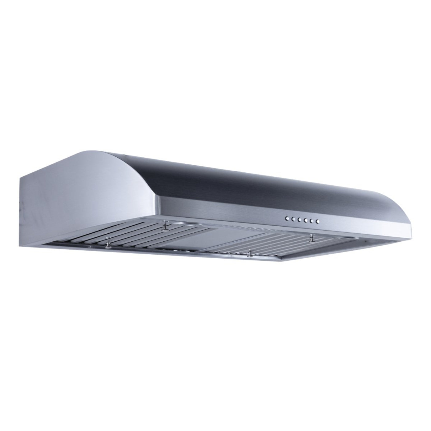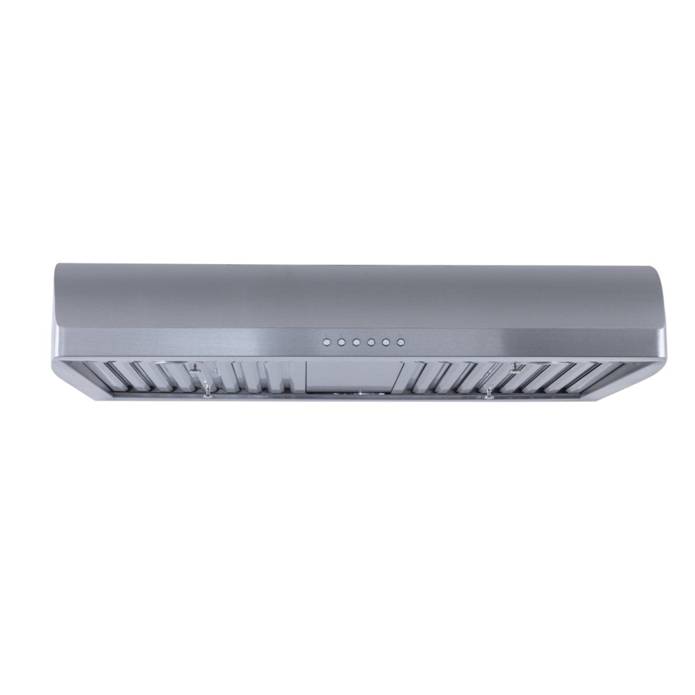 A: It is a low-profile, under-cabinet range hood with a 900 CFM motor, designed for ducted installation, featuring a modern stainless steel finish that complements contemporary kitchen designs.