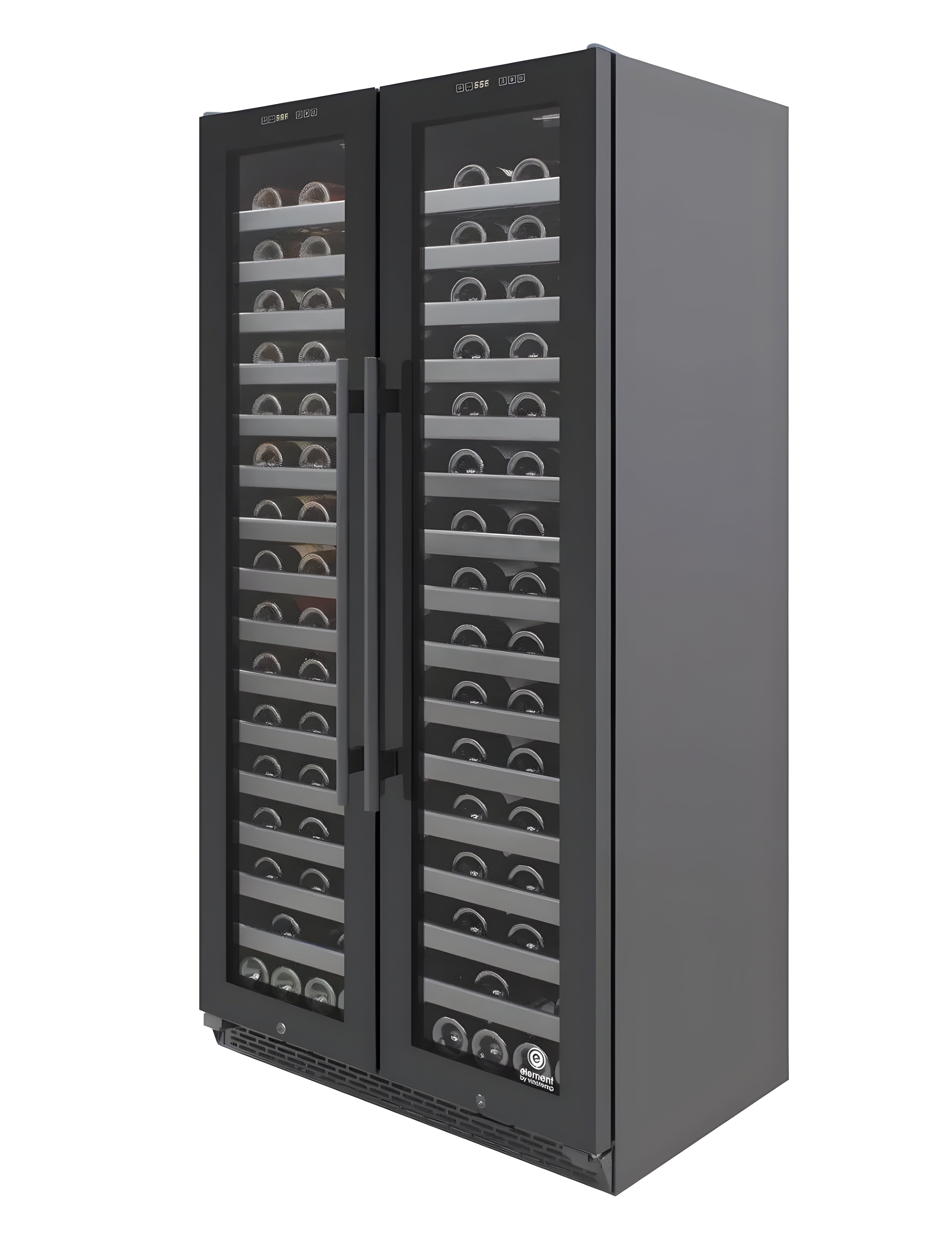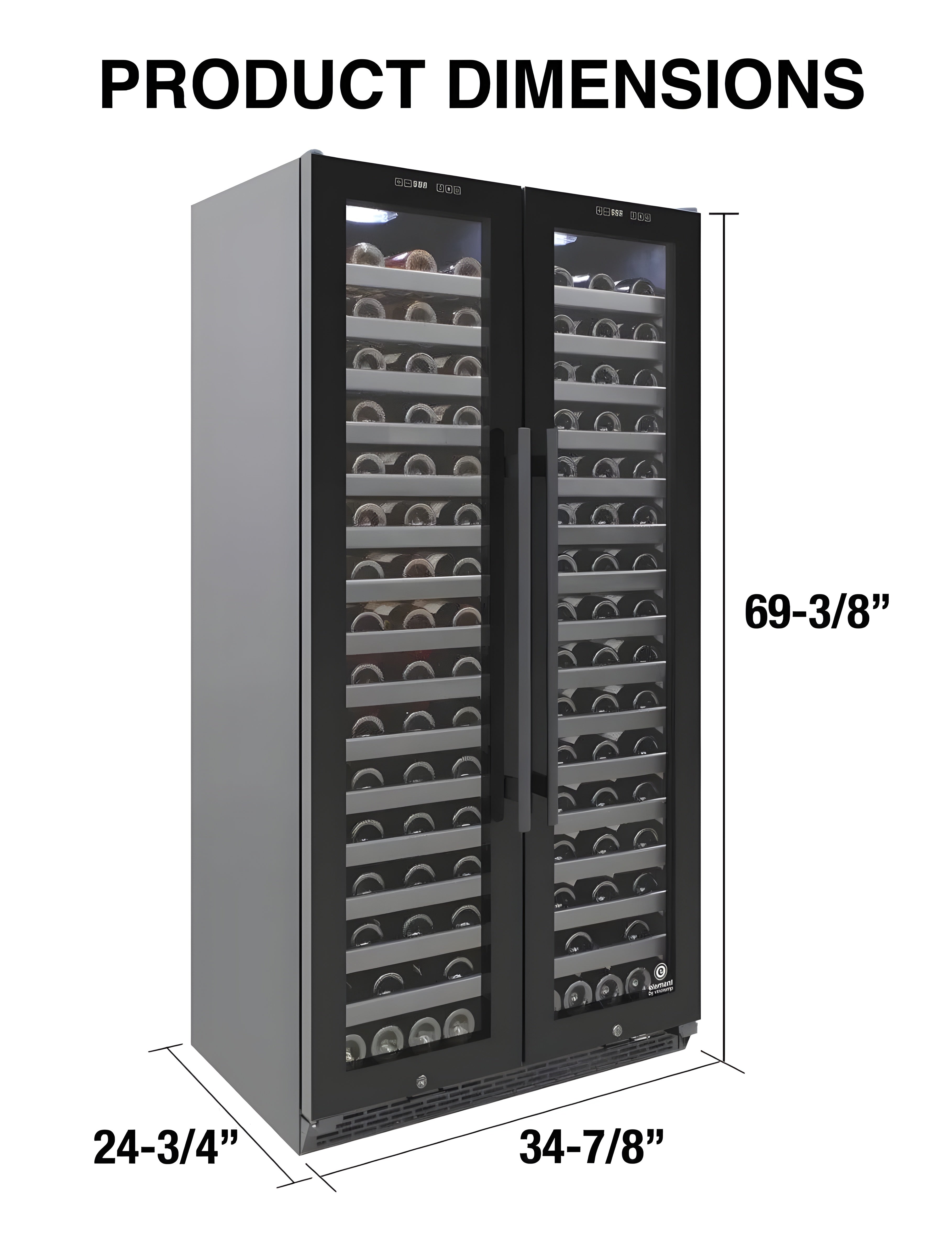 The sleek 36-Inch Double-Door Wine Cooler allows you to accurately control the temperature of your favorite wine bottles with two exact temperature controlled zones. This unit features two dual-paned glass doors with pole handle that separate the wine storage in the left zone and right zones. Outfitted with 15 Ouzogliding wire racks with black lip on each zone, this wine cooler can hold approximately 180 bottles in two exact cooling zones combined. This state of the art cooler also features a black cabinet, all-glass technology, and touch screen control panel on the top of each door that allows changes to your wine temperature setting. This unit is designed for built-in installation and is a must-have for the wine lover with an eye for style!