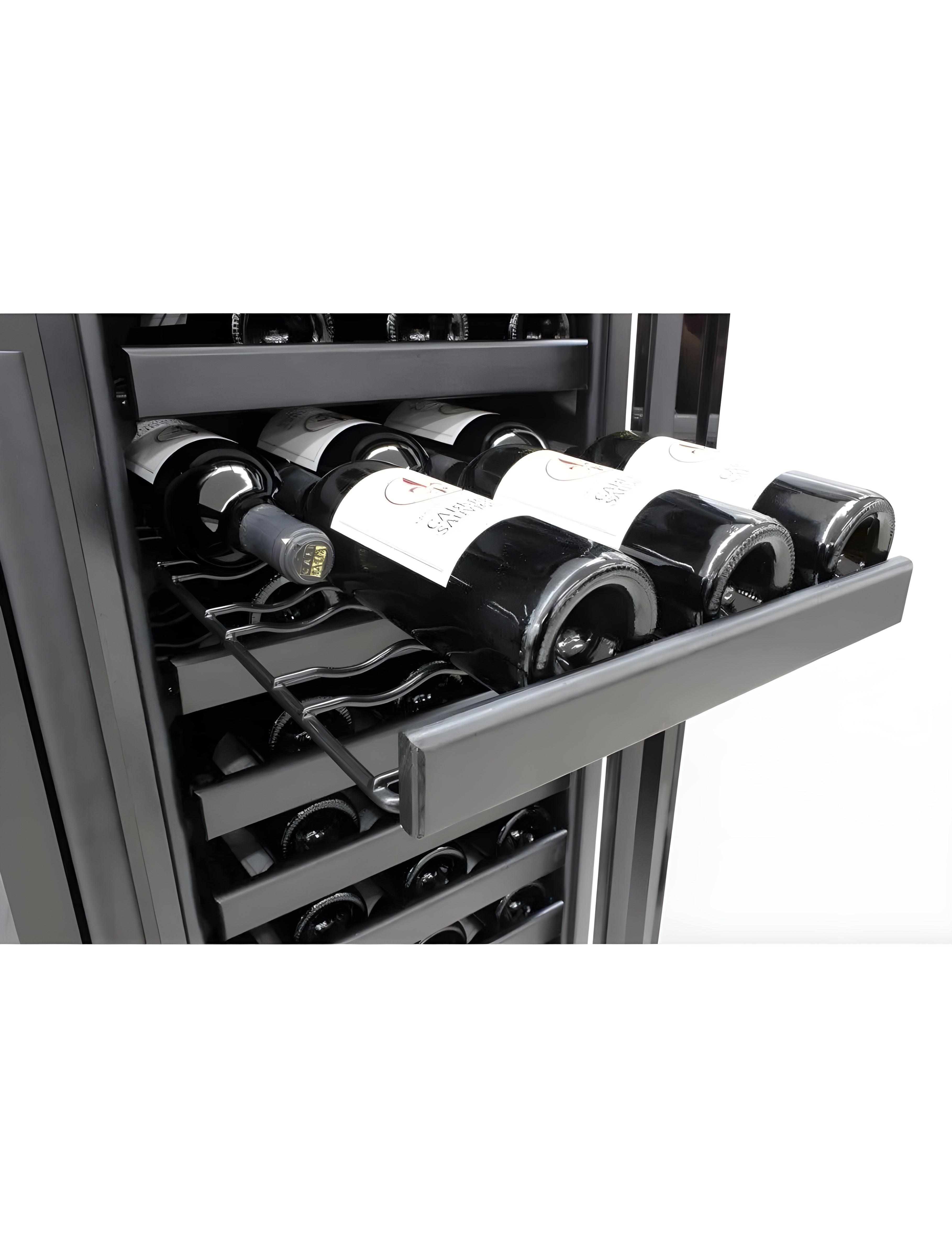 - 15 gliding metal shelves with black wooden lip per zone, a Vinotemp exclusive!*