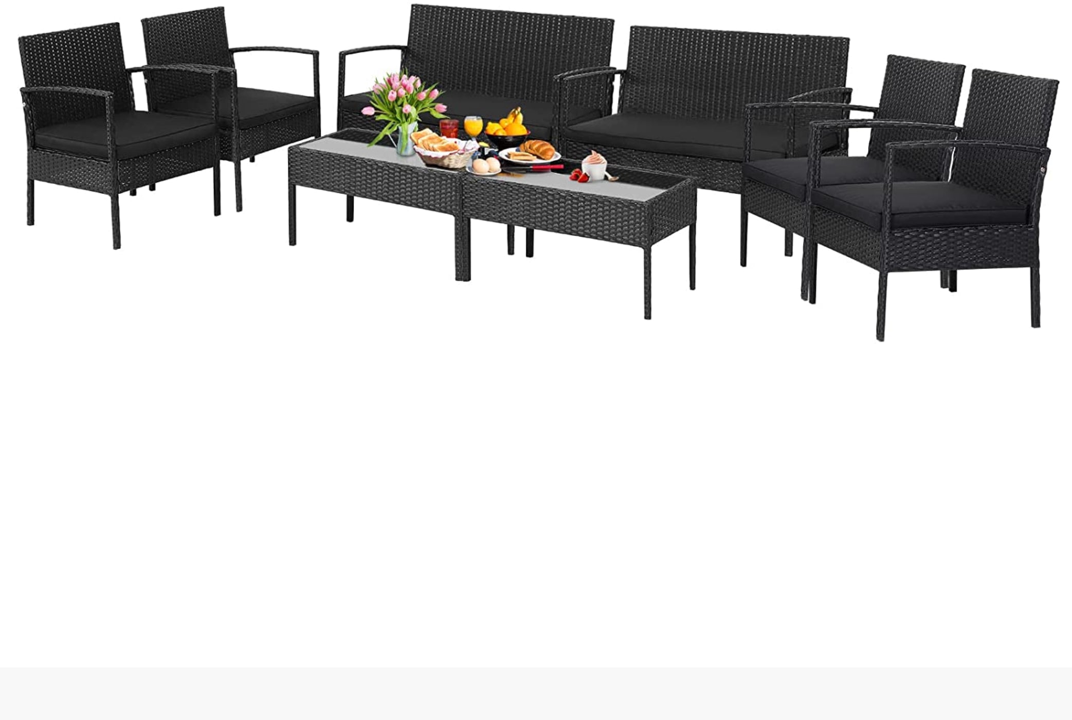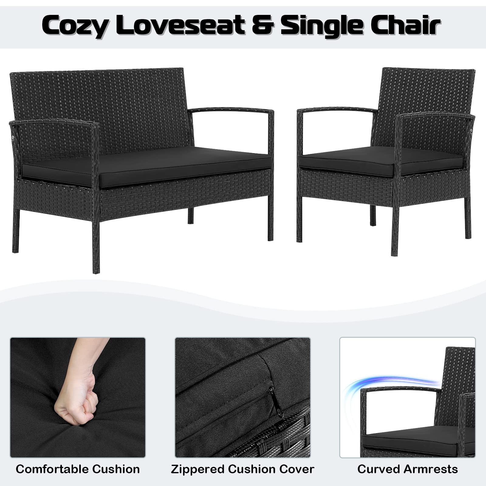 This 4-piece patio wicker set will be a perfect addition to your outdoor relaxing space. Including 2 single sofas, 1 loveseat, and 1 table, the patio set provides ample space for four people to sit together. And the high backrest, curved armrests, and soft cushion offer you a comfortable sitting experience. Furthermore, with heavy-duty steel structure and premium PE rattan, all 4 pieces are of high stability and durability. And the coffee table with a spacious tabletop provides much convenience for you. What's more, the stylish and elegant look makes the patio set ideal for multiple places, such as poolside, backyard, balcony, and so on.