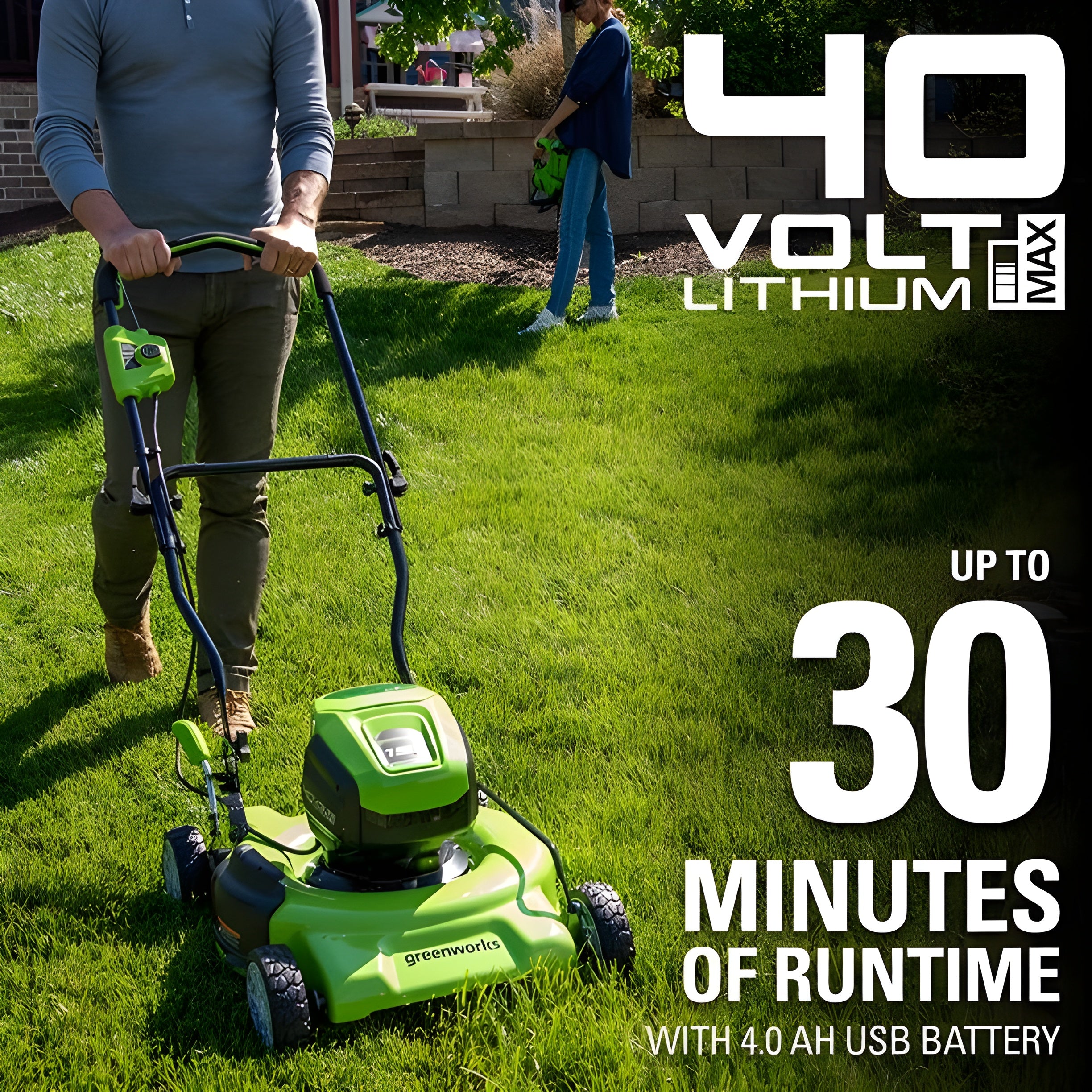 A: The Greenworks 40V 19" Cordless Push Mower is a battery-powered lawn mower that features a 19-inch cutting deck. It comes with a 4.0Ah USB battery and charger, offering a quiet, eco-friendly alternative to traditional gas-powered mowers for maintaining small to medium-sized lawns.