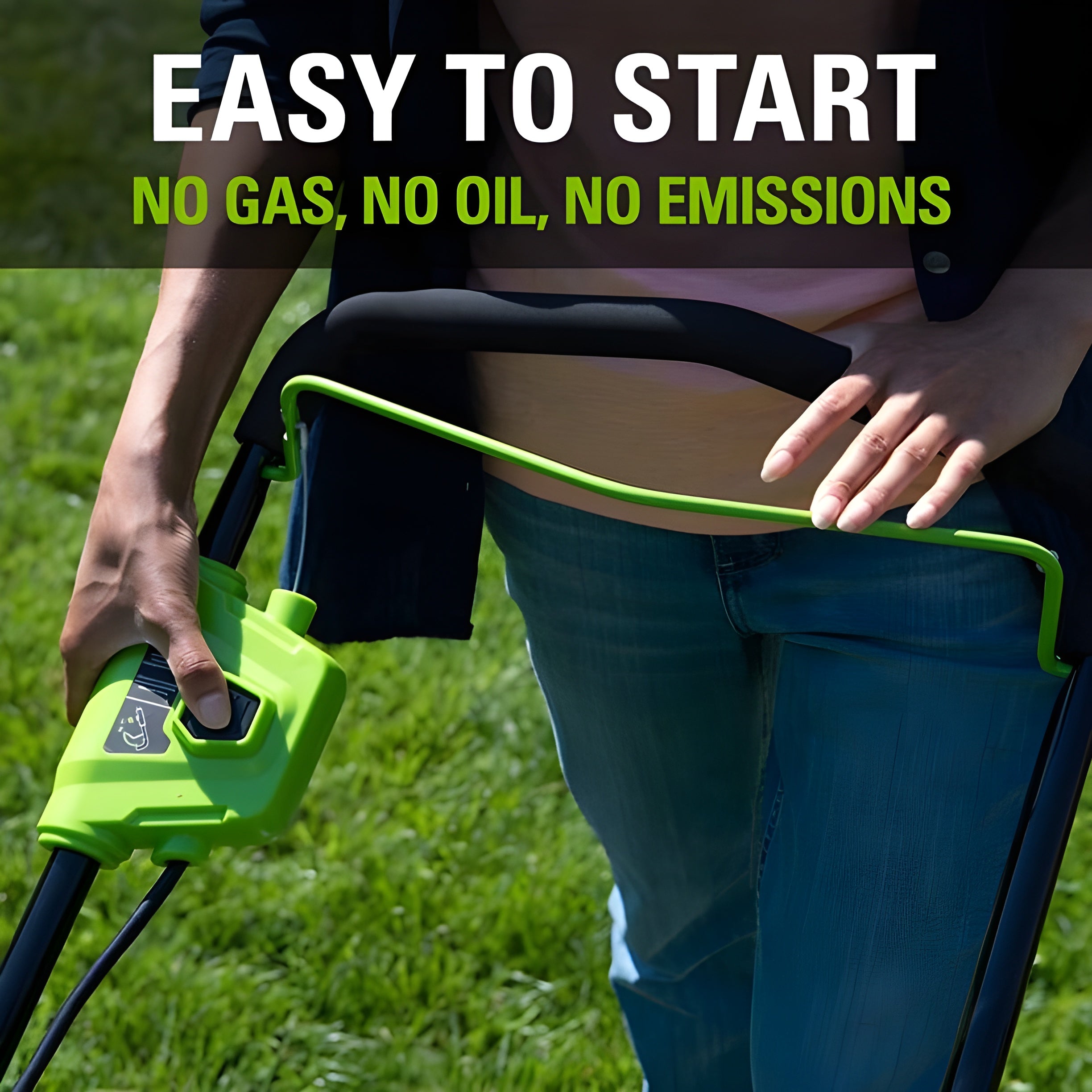 Powerfully easy. Simple to start with just the push of a button. Gentle on the ears because it mows quietly. A cinch to store in small spaces, you can even hang it up if you want to.