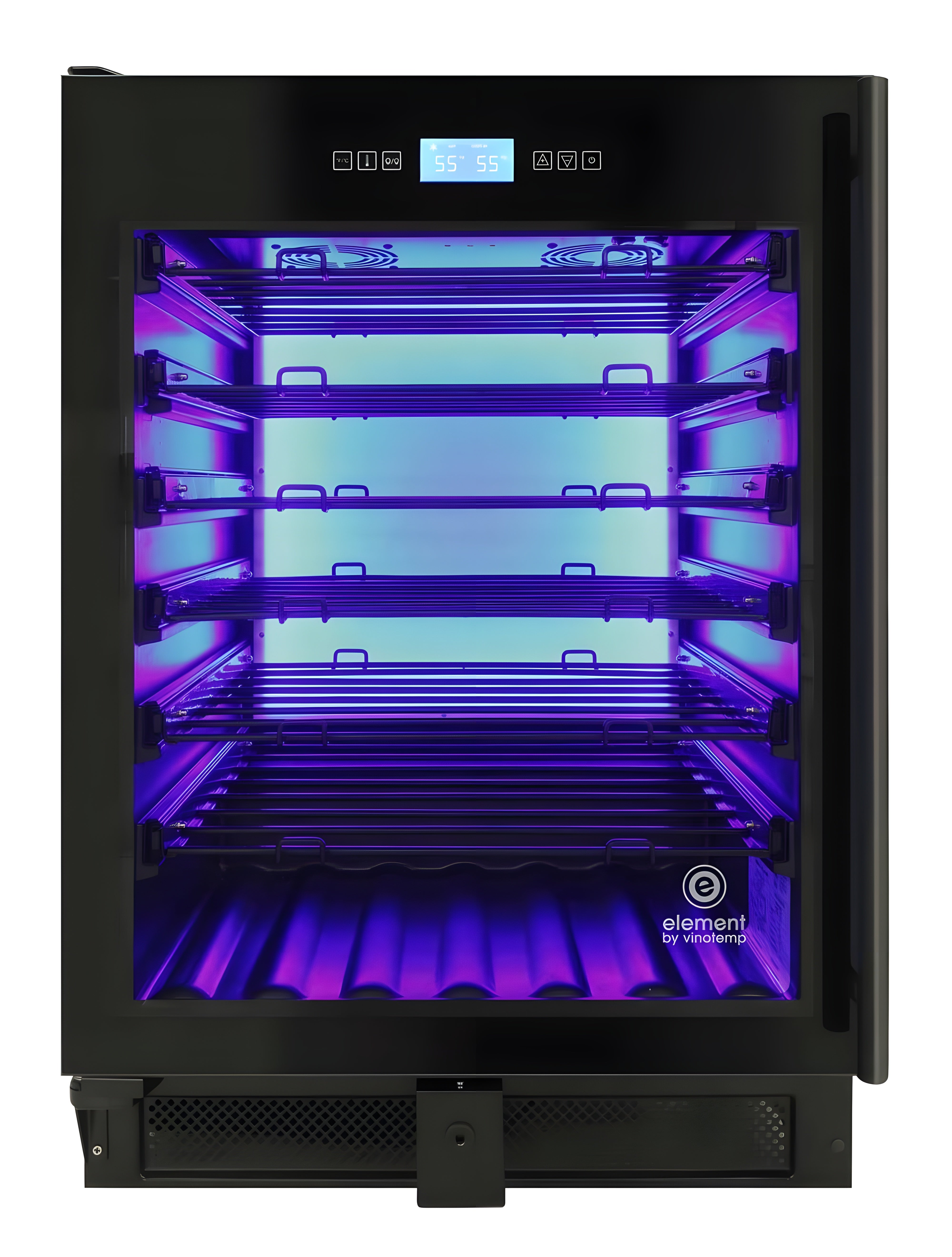 Store your wine collection in this elegant Vinotemp 41-Bottle Single-Zone Wine Cooler. Featuring seamless, all-glass technology, this all-black wine refrigerator has room to store up to 41 bottles on six telescopic shelves and 1 bulk storage section. A digital temperature touchscreen controller located at the top of the cooler allows you to see and set the temperature without having to open the cooler door. Its patented interior Backlit panel lighting has three different color options - Heliotrope, Amber, and Vinotemp BioBlu (which helps reduce the growth of bacteria and mold) - and can be selected at any give time. This wine refrigerator is front venting with easy installation to build in and fit perfectly in any kitchen or bar area. Sturdy, stylish patented label forward VinBo Racks in black cradle bottles so the labels of wine stored are front facing while the racks glide and extend forward, adding to the cooler's visual appeal and ease of use. A full glass door with black edge and door lock add to the style and functionality of this cooler. This wine cooler will make your small to medium sized wine collection stand out.
