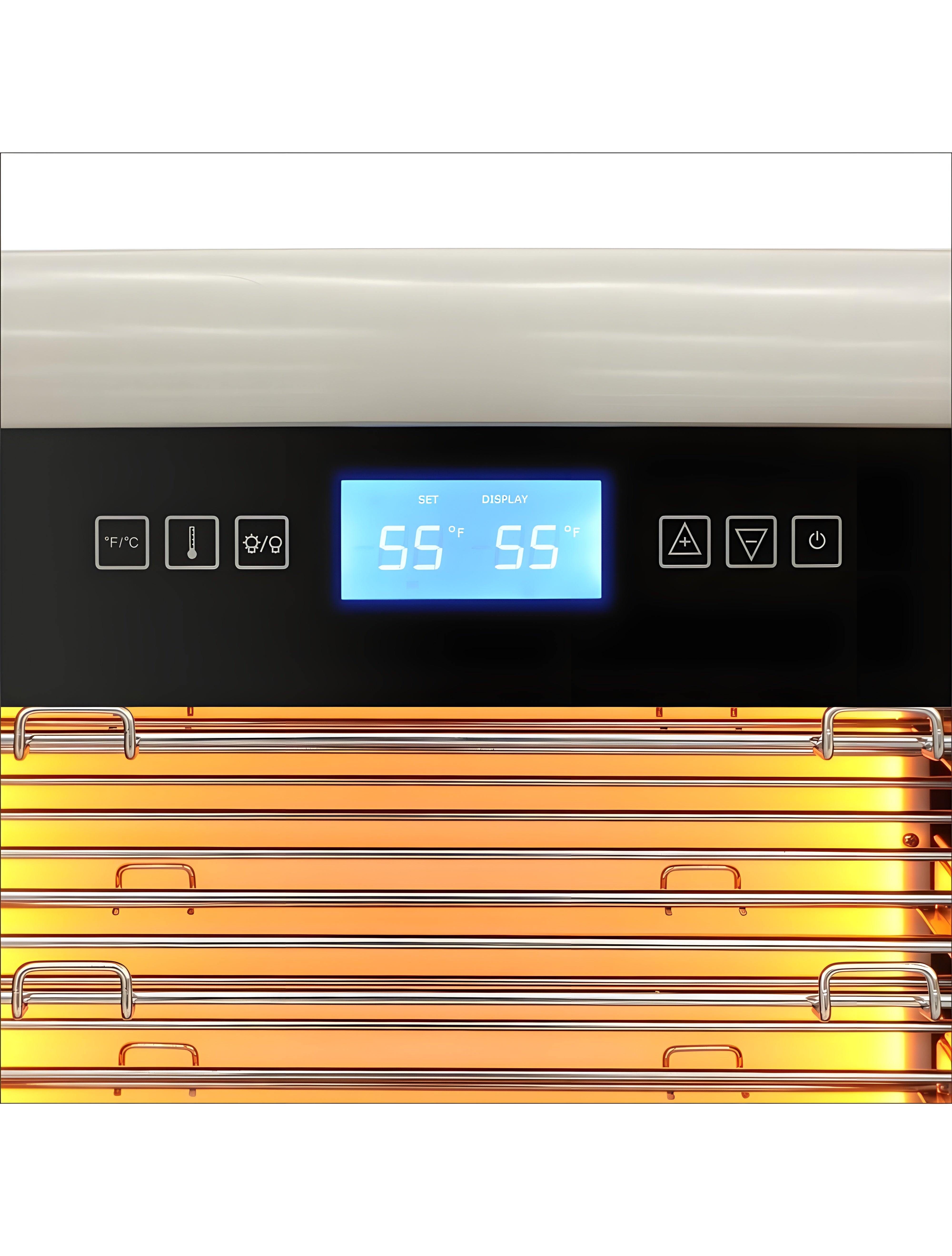 • Patented interior Backlit (baklīt) panel: Heliotrope, Amber, and Vinotemp BioBlu back-lit (U.S. Patent No. D868,849 S)