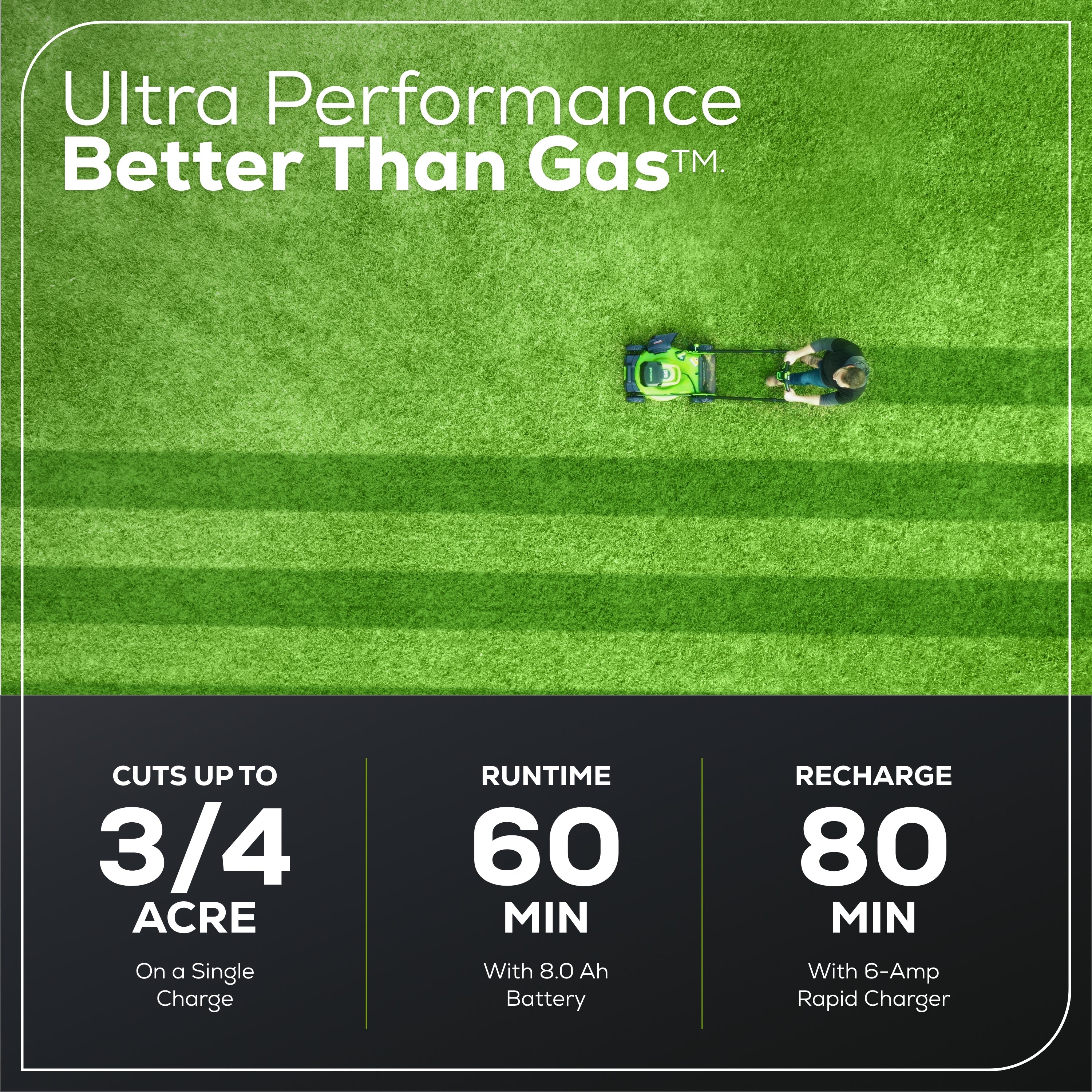 - Cut up to 3/4 acre with up to 60 min of runtime on a single charge