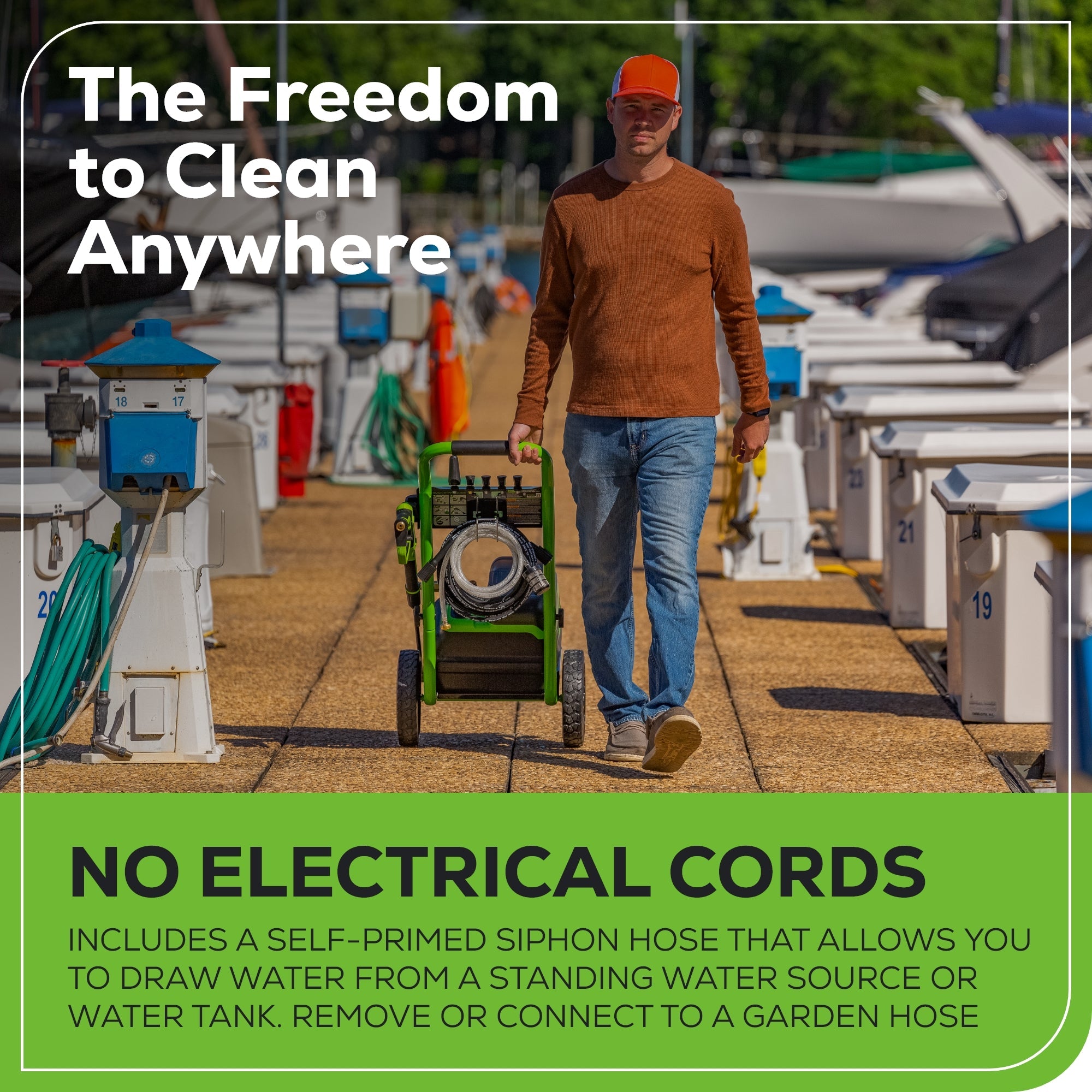Eco-Friendly & Quiet Operation: The battery-powered design provides a quieter, emission-free alternative to gas-powered washers, making it more eco-friendly and suitable for residential areas where noise can be a concern.