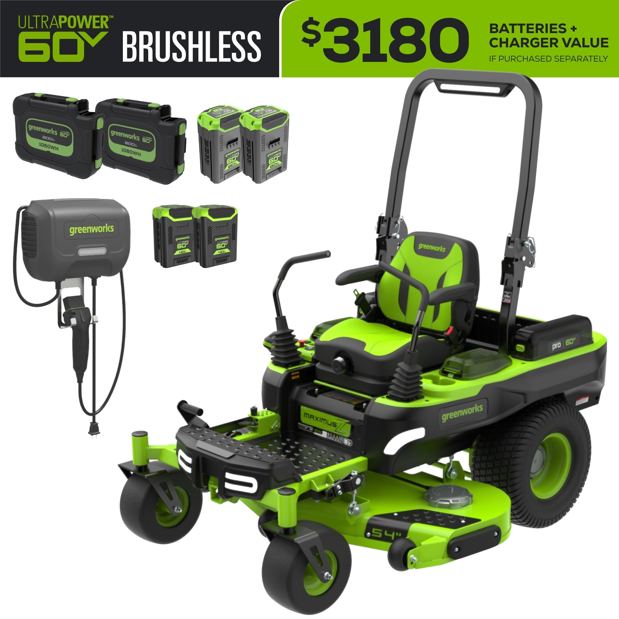 60V 54" MaximusZ Zero Turn Riding Mower with (2) 20.0 Ah, (2) 8.0 Ah & (2) 4.0 Ah Batteries and 1.5kW Charger