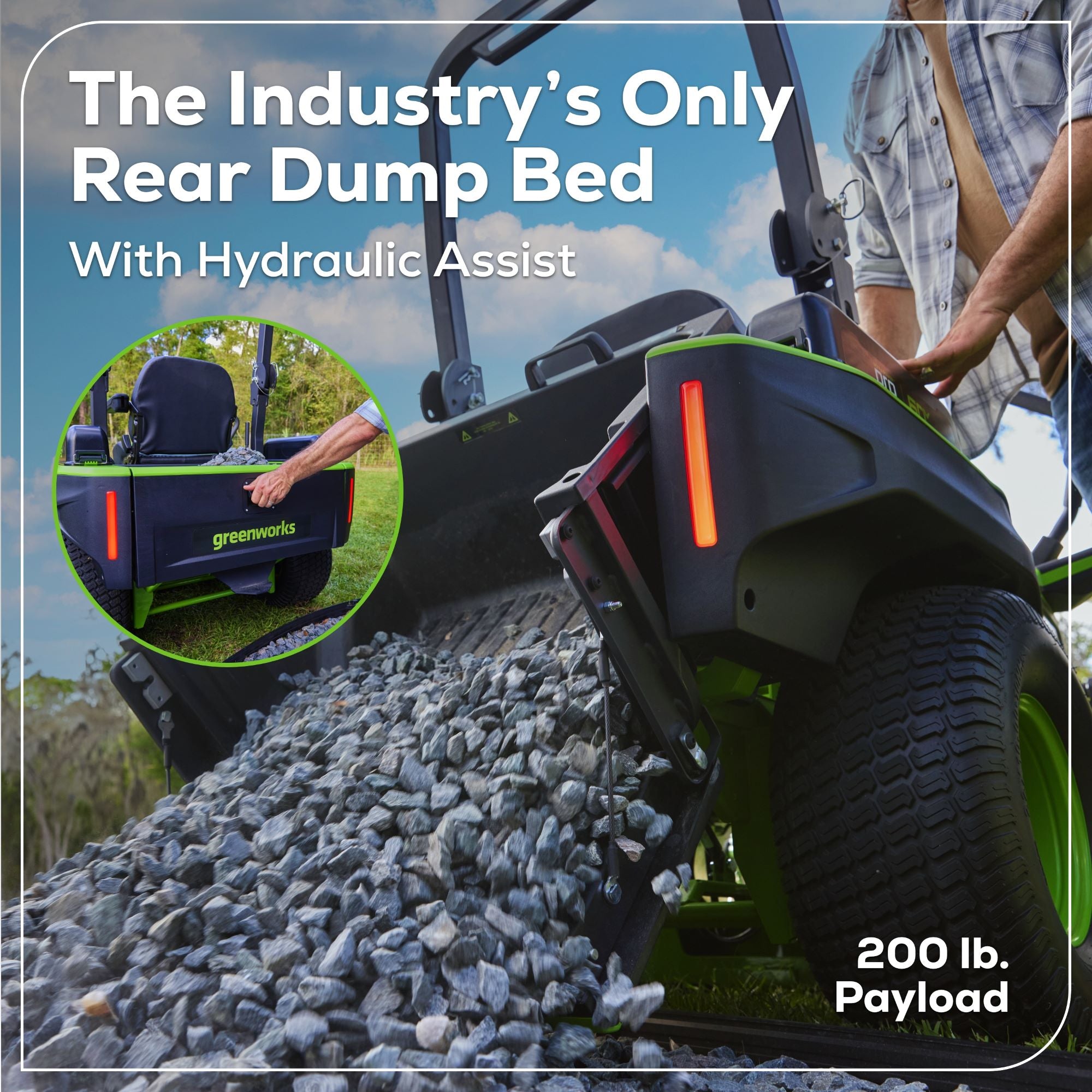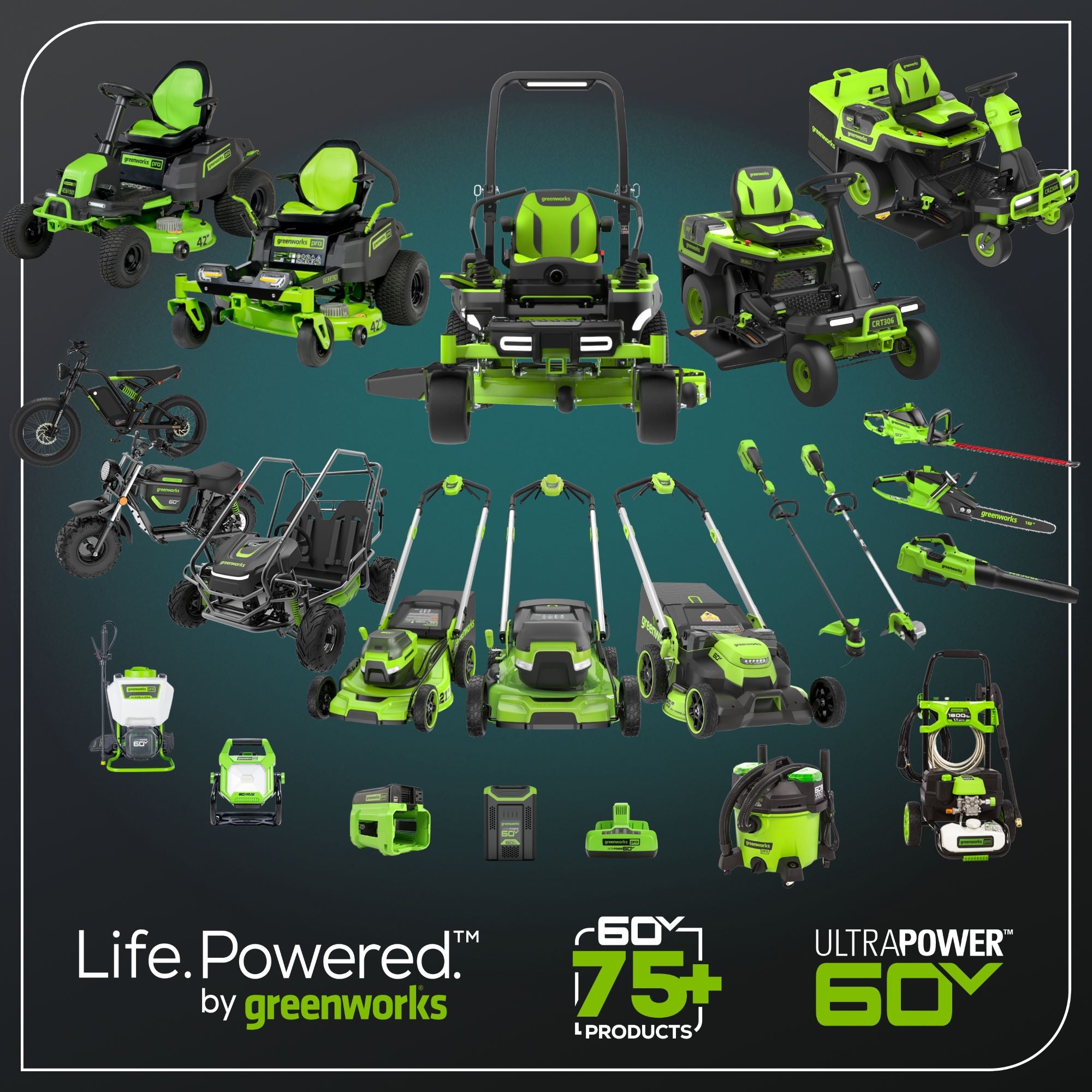 Mow over 4 acres on a single charge with the Greenworks 60V 60” Maximus Lawn Tractor. Recharge in less than 4 hours. Features high torque cutting motor for tough grass, standard wheel steering, and speeds up to 8 MPH. Equipped with two high-torque brushless hub motors, delivering power equivalent to a 31 HP gas engine. Includes (2) 20.0 Ah Batteries and (4) 8.0 Ah Batteries and 1500-Watt Charger. Compatible with 75+ Greenworks 60V products.