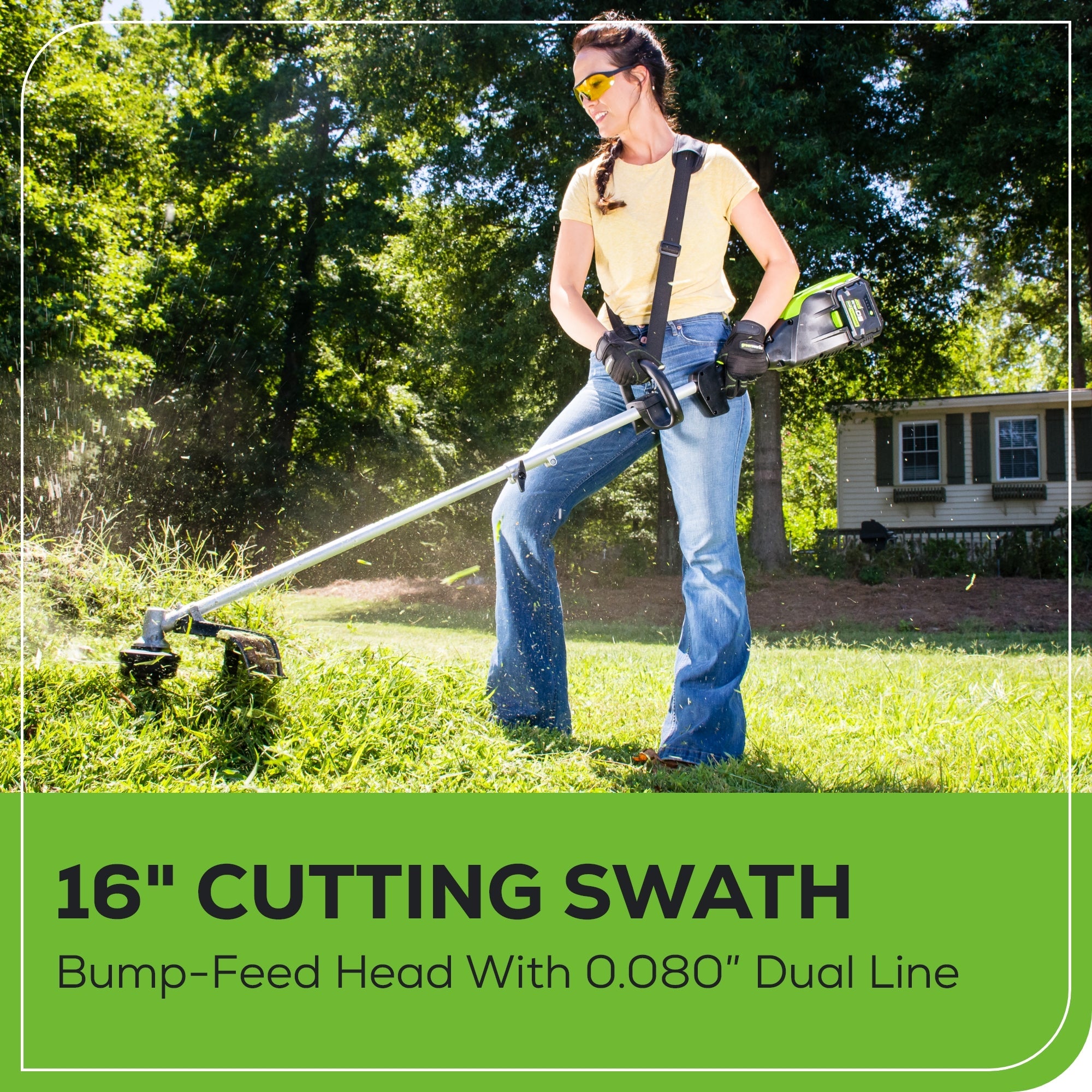 - Wide 16" cut path with a .080" dual line bump feed head rips through weeds in your yard