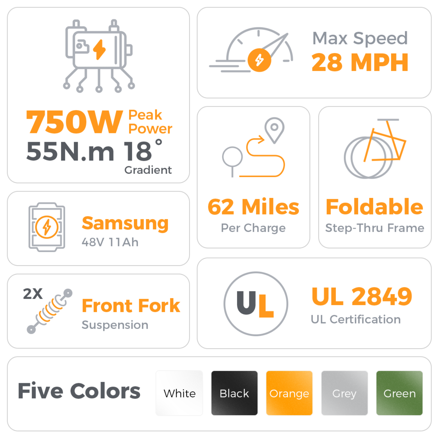 • Battery: 48V 12AH Samsung battery, up to 68 miles range