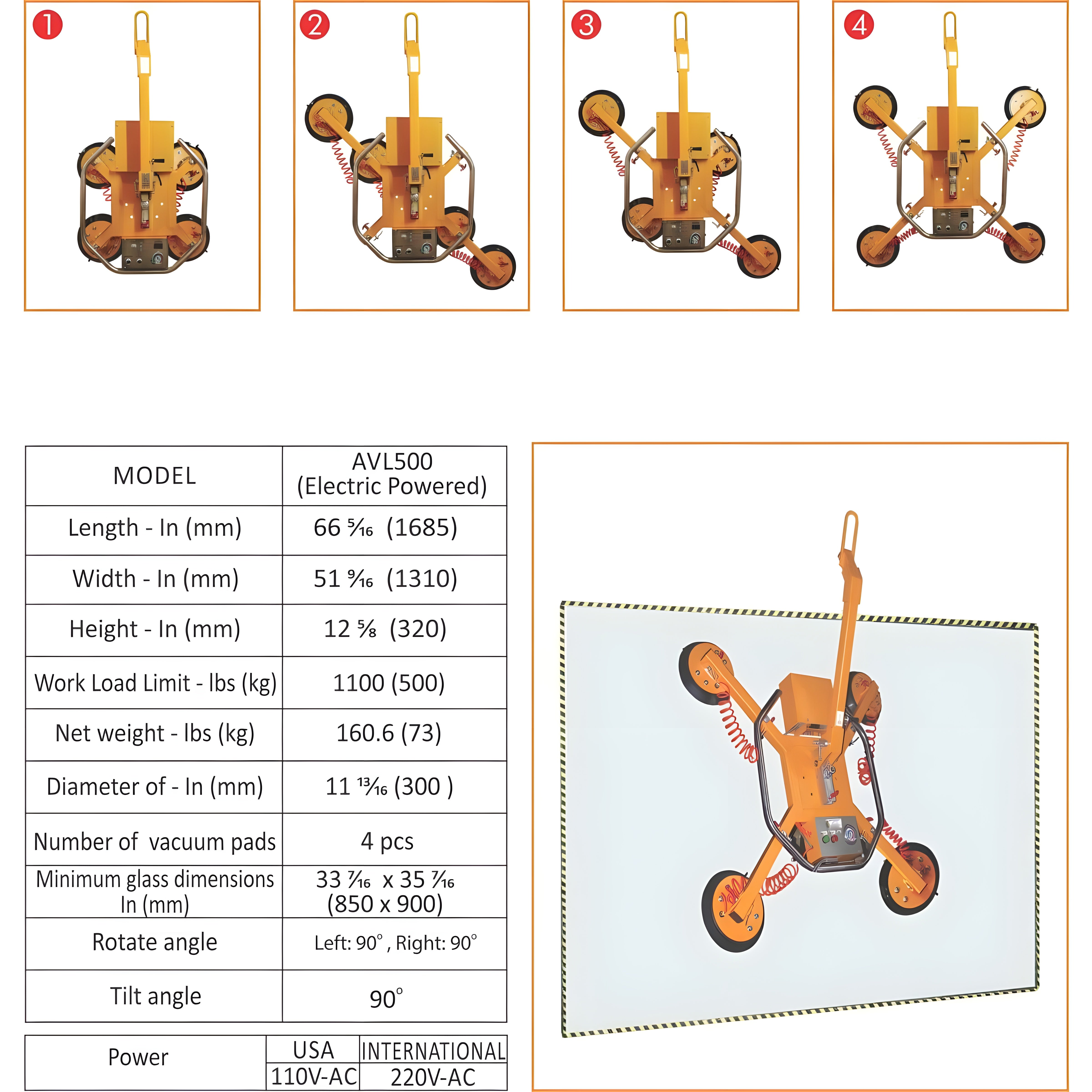 A: The AVL500 is engineered for safely and efficiently lifting, handling, and positioning glass panels and other non-porous materials in industrial and construction applications.