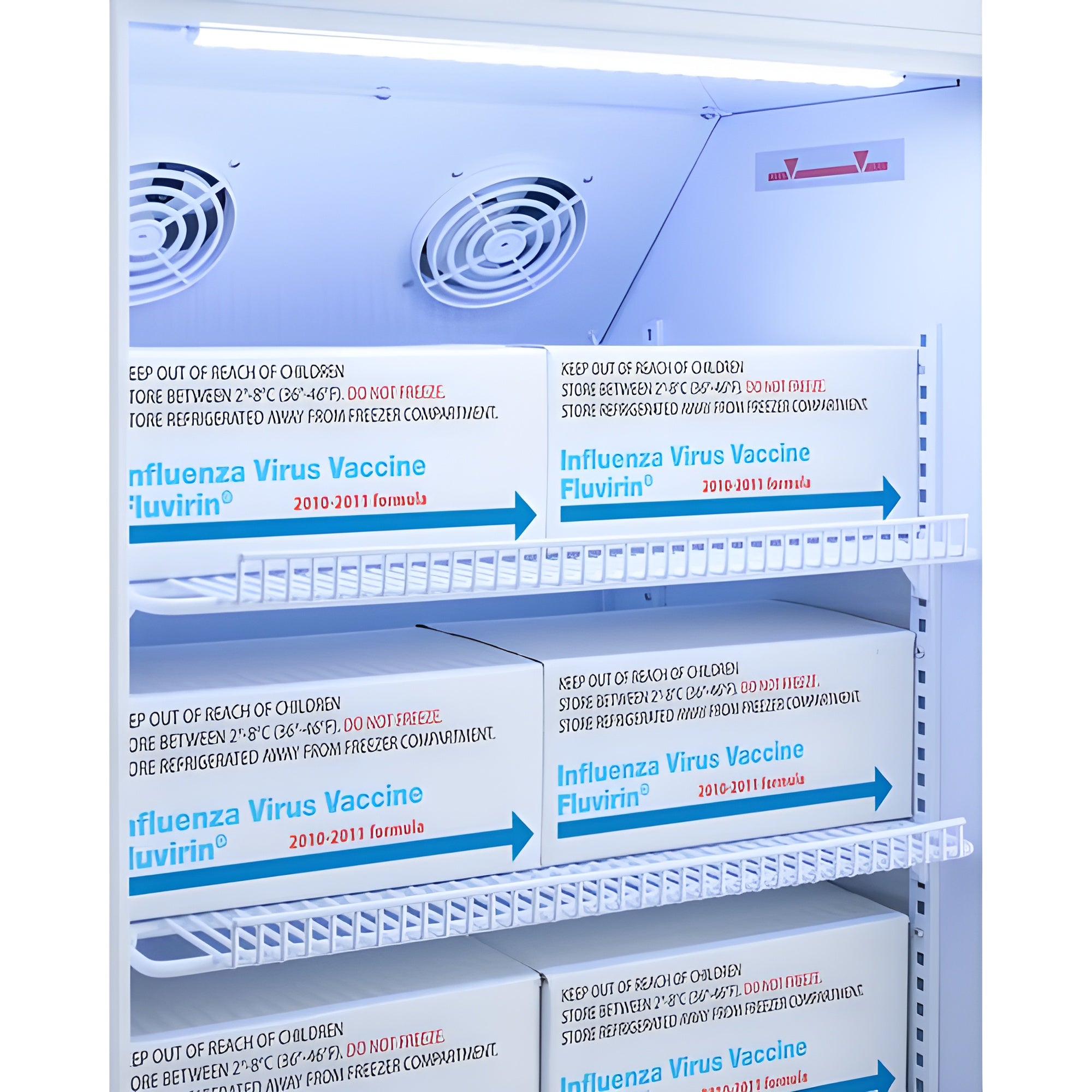 The Accucold ARS6PV-AFZ5PVBIADASTACKLHD offers a stackable refrigerator-freezer combination for vaccine storage, designed to meet CDC and VFC guidelines. This unit features a microprocessor temperature controller with precise temperature ranges for both the refrigerator (+2 to +8ºC) and freezer (-30 to -10ºC). Equipped with audible and visual alarms, including power failure and door open alerts, it ensures safe and accurate storage conditions. The refrigerator's forced air cooling system guarantees temperature stability, while adjustable shelves allow for customizable storage. The freezer, with static manual defrost, provides additional storage space. Both units include antimicrobial handles and hospital-grade safety cords for a cleaner, safer user experience. Stacked together, they offer a compact, efficient solution for managing vaccine storage in compliance with health and safety standards.