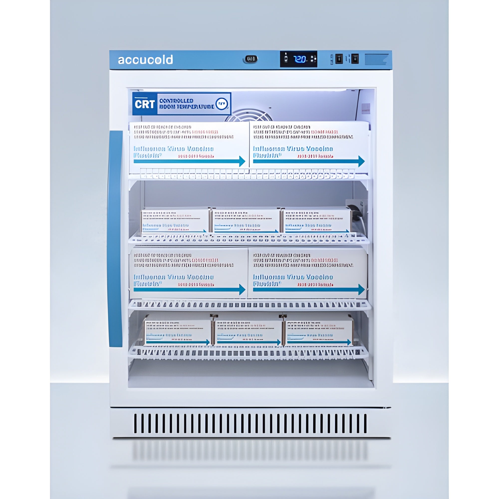 Performance Series Controlled Room Temperature CabinetThe ARG6PV-CRT is a 6 cu.ft. upright storage unit designed for stable room temperature medication storage. Pre-set to 72ºF, it offers an adjustable range from 68º to 77ºF, making it ideal for ADA-compliant applications. A microprocessor temperature controller is externally located to reduce door openings, while a buffered temperature probe encased in a glycol-filled bottle ensures precise temperature simulation. Audible and visual alarms alert users to temperature fluctuations, power failures, or sensor issues. Optimized forced air cooling and adjustable cycle defrost maintain stability, while adjustable wire shelves offer flexible storage. The double-pane tempered glass door features a self-closing function, a factory-installed lock with two keys, and a user-reversible swing. A hospital-grade cord with a 'green dot' plug enhances safety. The unit’s antimicrobial handle, white powder-coated metal interior, and LED lighting contribute to a cleaner, more durable design for high-traffic environments.