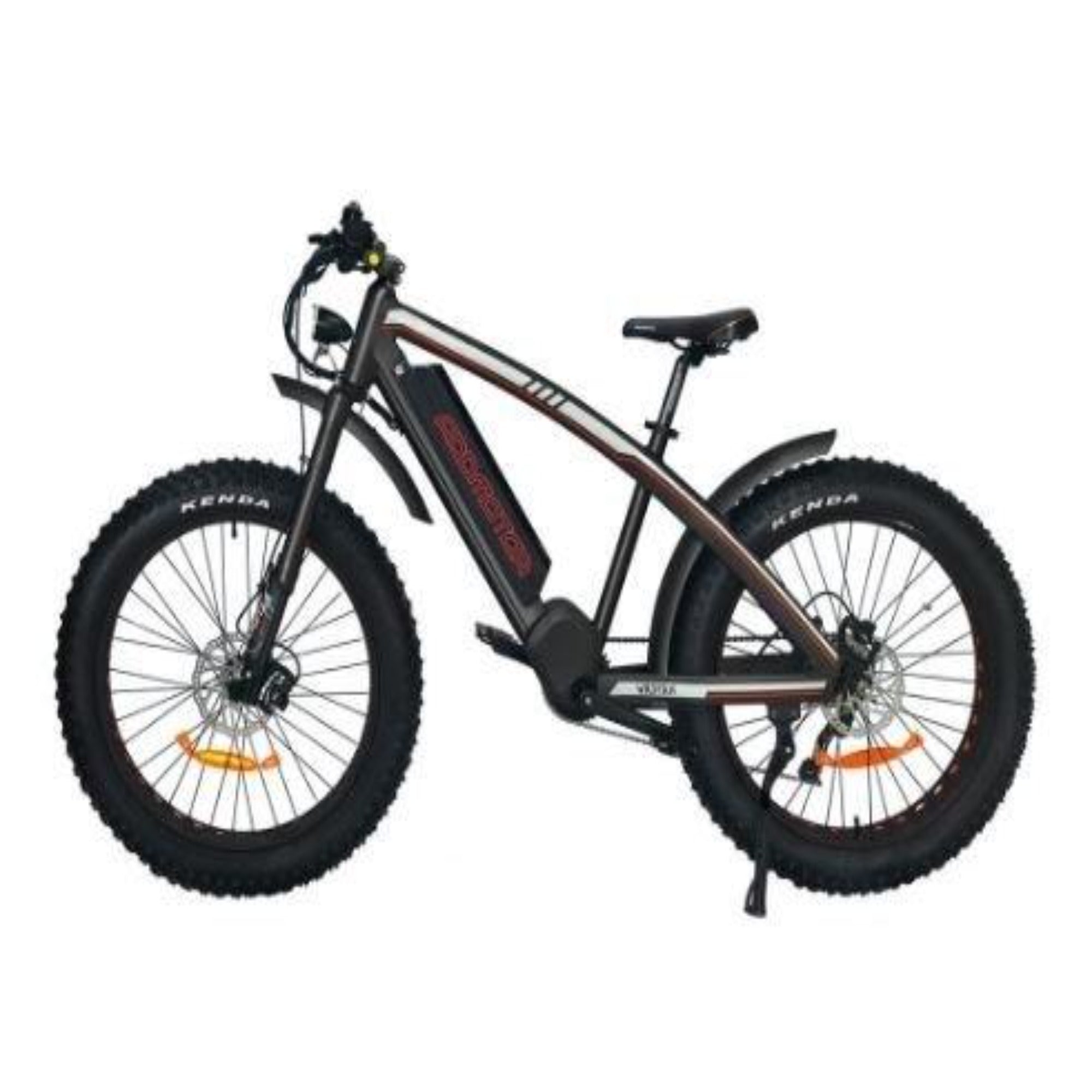 Tires: Kenda Juggernaut Pro 26" x 4.5" fat tires, providing excellent traction on various surfaces.