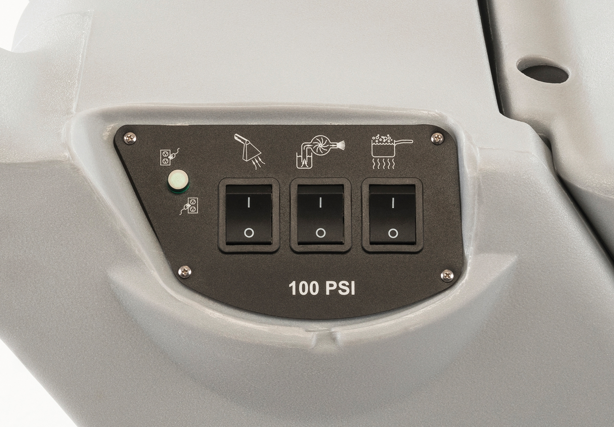 3-stage vacuum motor for superior water recovery Easy-fill solution tank access port to avoid spills on electrical components Pressure gauge and regulator for precise pressure control Oversized, rubber grip rear wheels for easy transport Two handles for enhanced maneuverability Sealed system reduces wear, extends vacuum motor life Hot or cold water options for various cleaning needs |