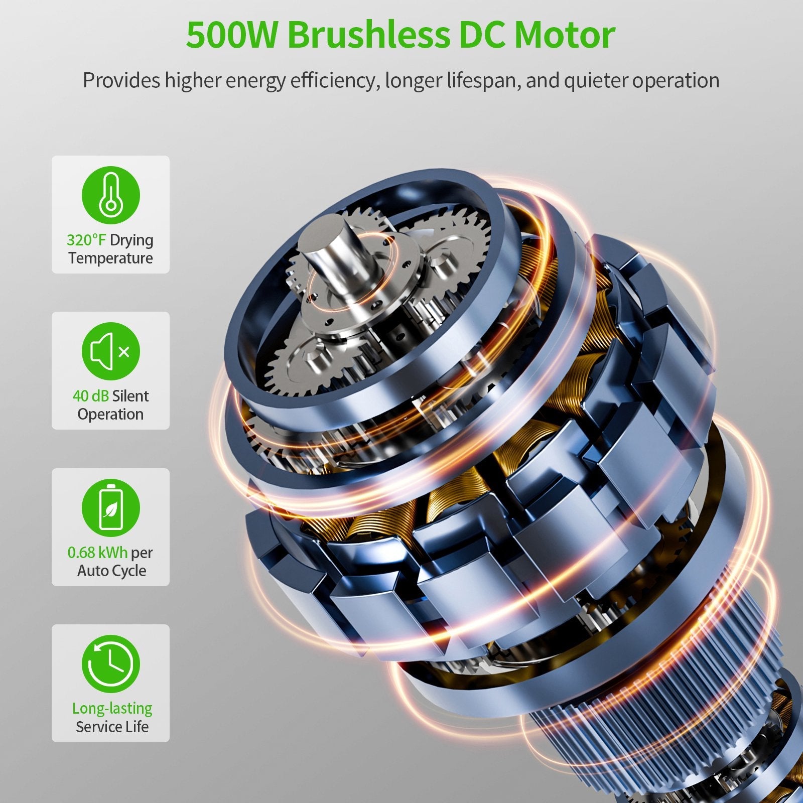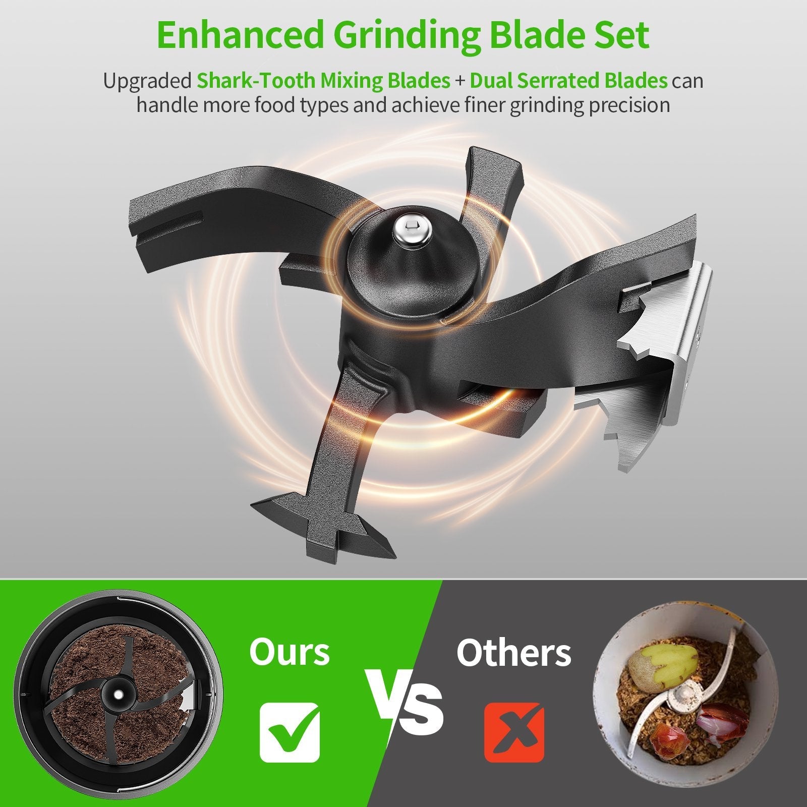 Upgraded Grinding System Equipped with a 500W DC brushless motor and an advanced set of crushing blades, this composter effortlessly handling a wide range of food waste, including cooked bones and fruit pits. Its bidirectional rotation mode significantly reduces the risk of blockages when processing hard-shell and fibrous waste, ensuring efficient and hassle-free composting.