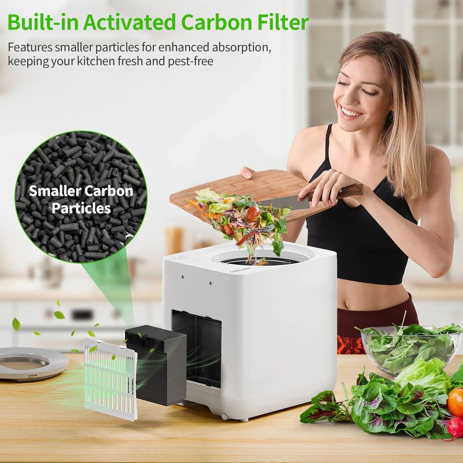 User-Friendly Design Operating at a noise level below 40 decibels, the electric compost bin is nearly silent. To ensure child safety, the machine automatically pauses when the lid is opened. Plus, smart reminder notifies you when it’s time to replace the activated carbon.