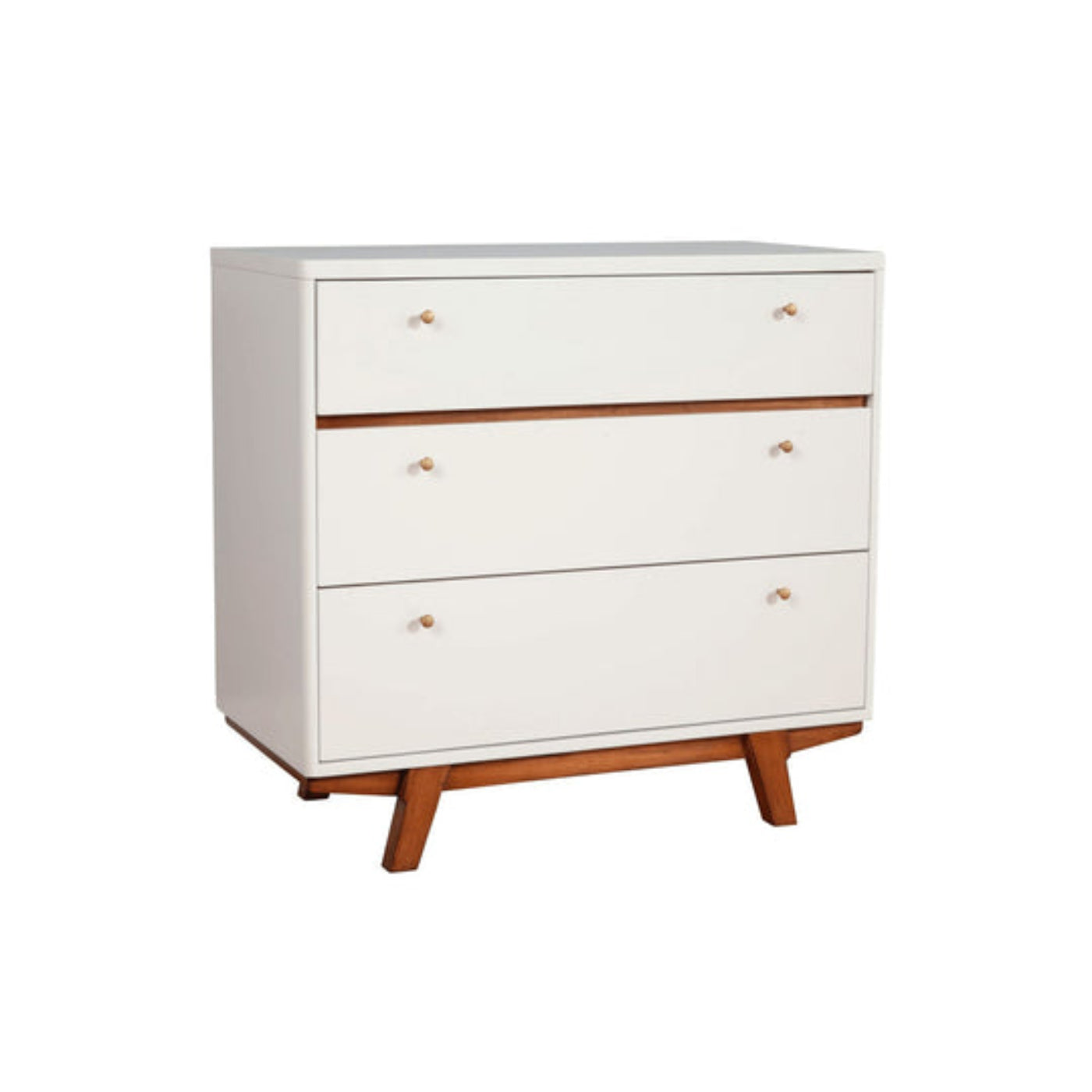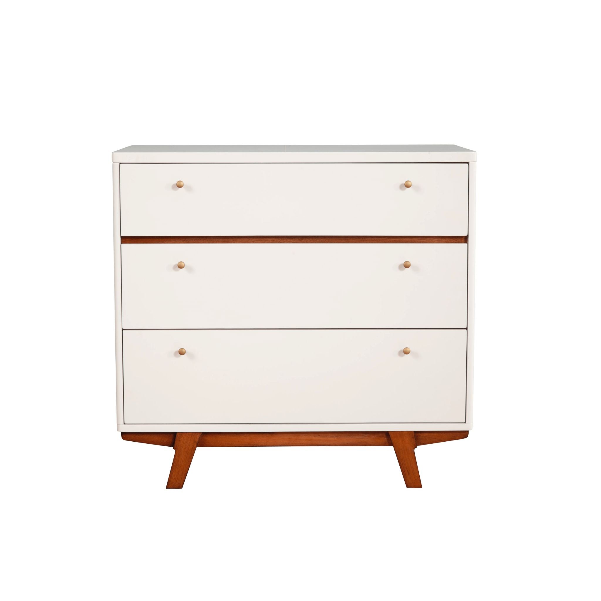Give your bedroom a stylish and modern, mid-century feel with this clean lined collection. The Dakota 3 drawer small chest is structurally sound and constructed with Mahogany wood solids & veneer in a white finish and trendy acorn brown accents. The Dakota collection hints at subtle refinement, without overpowering your current decor. Drawers feature English Dovetail Drawer Construction, felt lined top drawer to protect your valuables as well as metal ball bearing drawer glides The pieces in the Alpine Furniture Dakota collection fluidly fits in with a variety of aesthetics and color schemes to compliment your bedroom setting. Coordinate with other pieces from the Dakota bedroom collection.