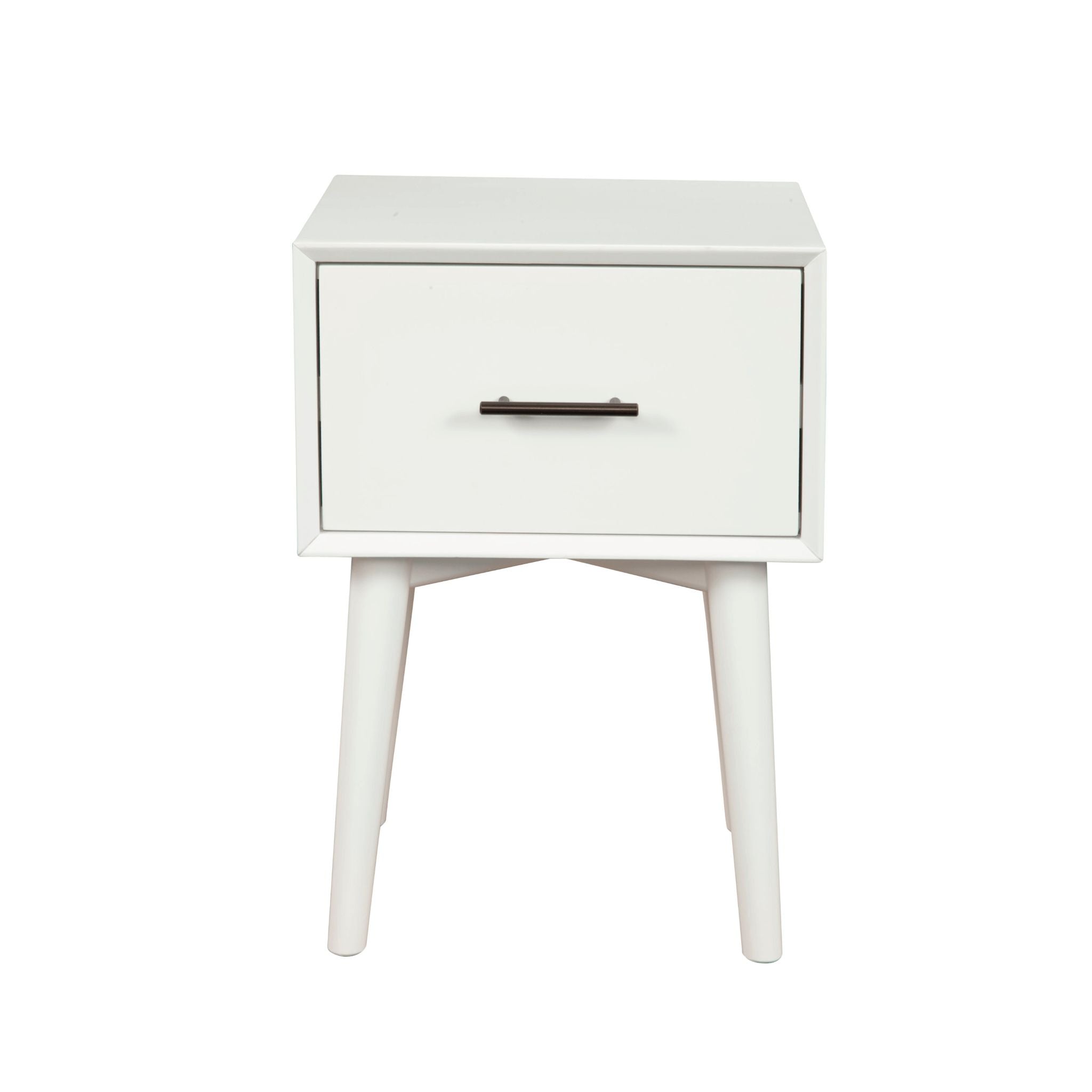 Lean over and grab your book or remote from the convenience of your sofa with the Flynn end table. Brimming with Mid-Century modern appeal, this piece is designed from Mahogany wood solids and Okume veneer and features clean-lines that work perfectly with contemporary spaces. Sleek, tapered legs add an understated look, while a spacious surface top is ideal for a stylish lamp or table clock. The storage drawer is felt lined. Available in a beautiful white finish. Mix and match with other pieces from the Alpine Furniture Flynn collection.