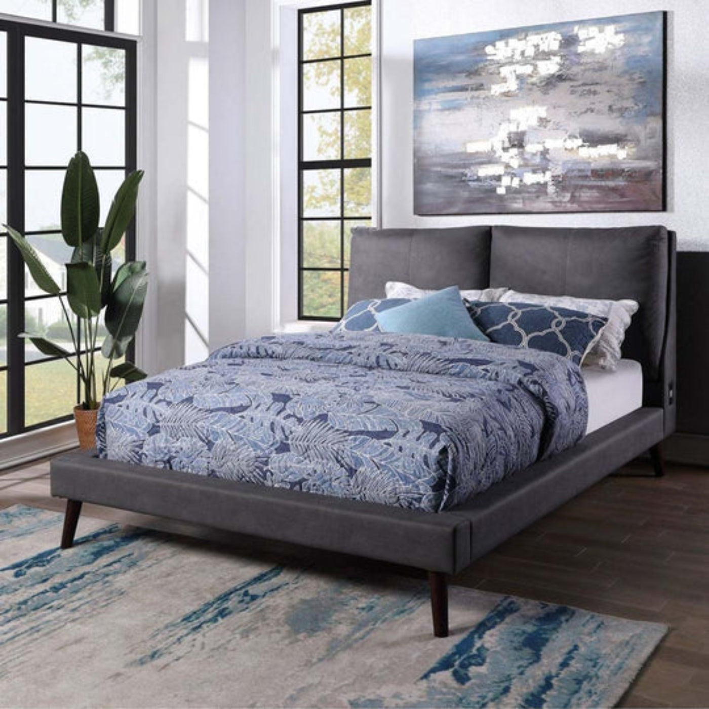 A: It’s a modern upholstered platform bed featuring a plush gray polyester fabric headboard, black tapered wooden legs, and built-in USB ports on both sides of the headboard.
