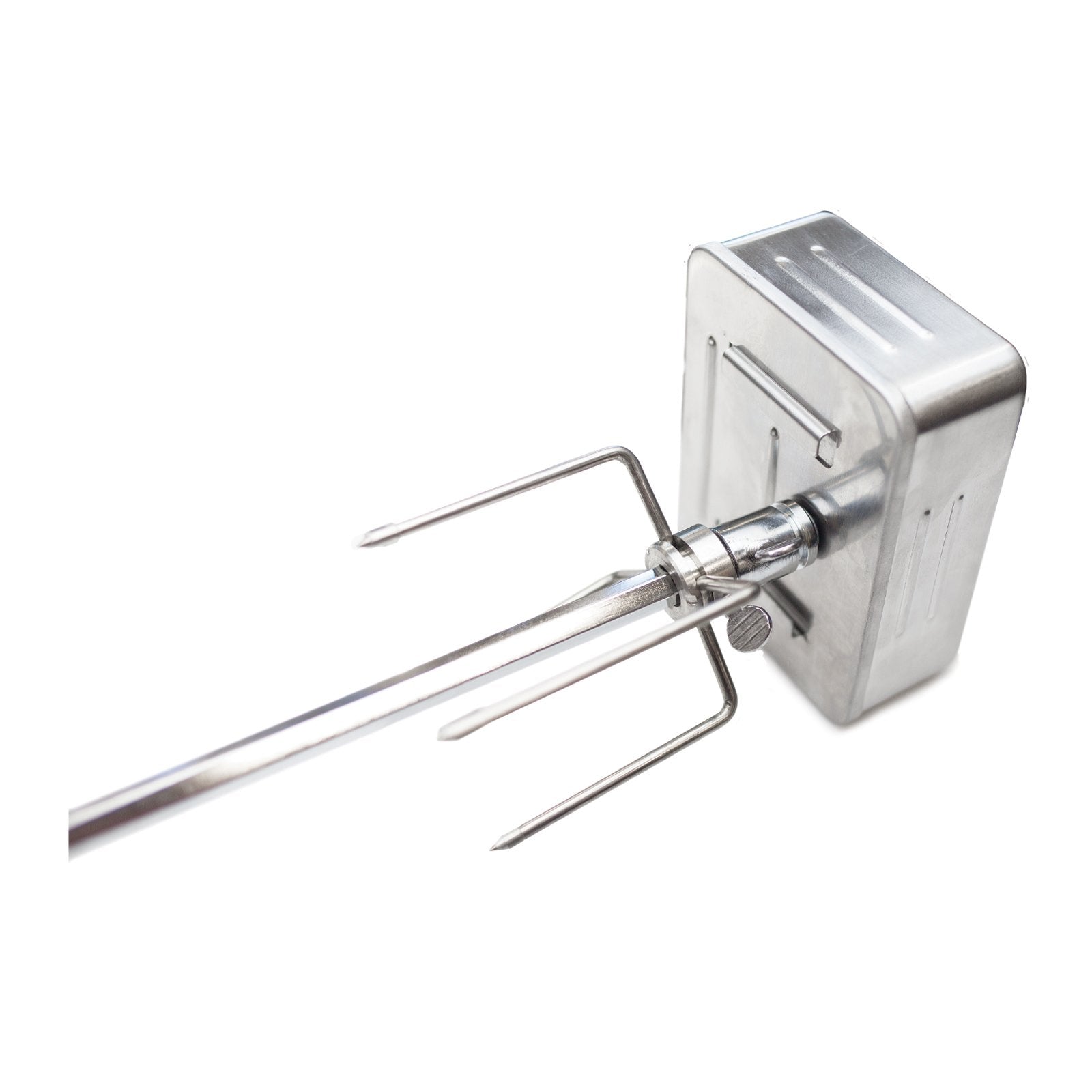 Rotisserie kit includes: stainless steel rod, forks, handle, bracket and motor.