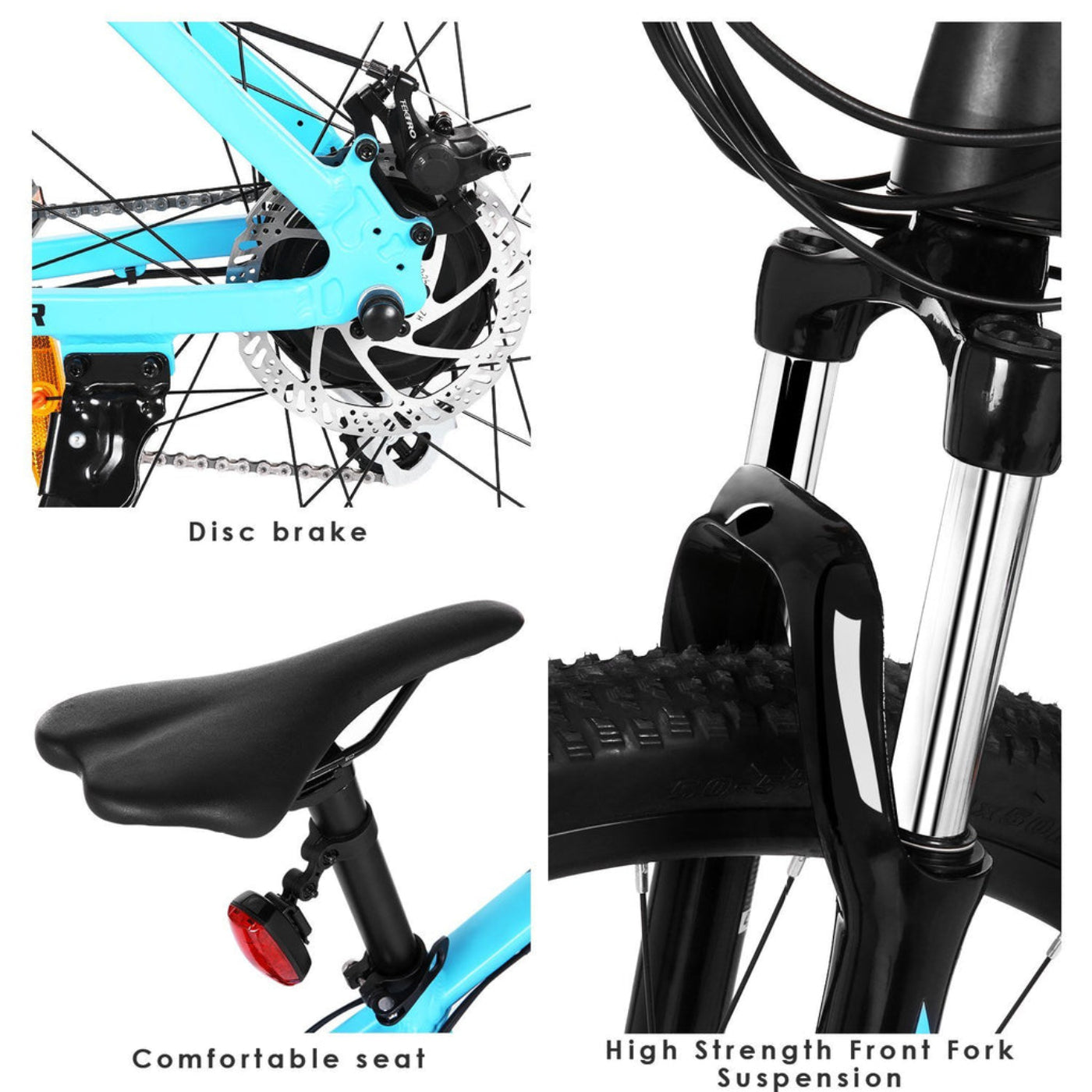 A: This bike includes a 350W motor, durable 27.5-inch wheels, a long-lasting battery for up to 30-50 miles per charge, and a sturdy aluminum frame for both comfort and durability on challenging terrains.