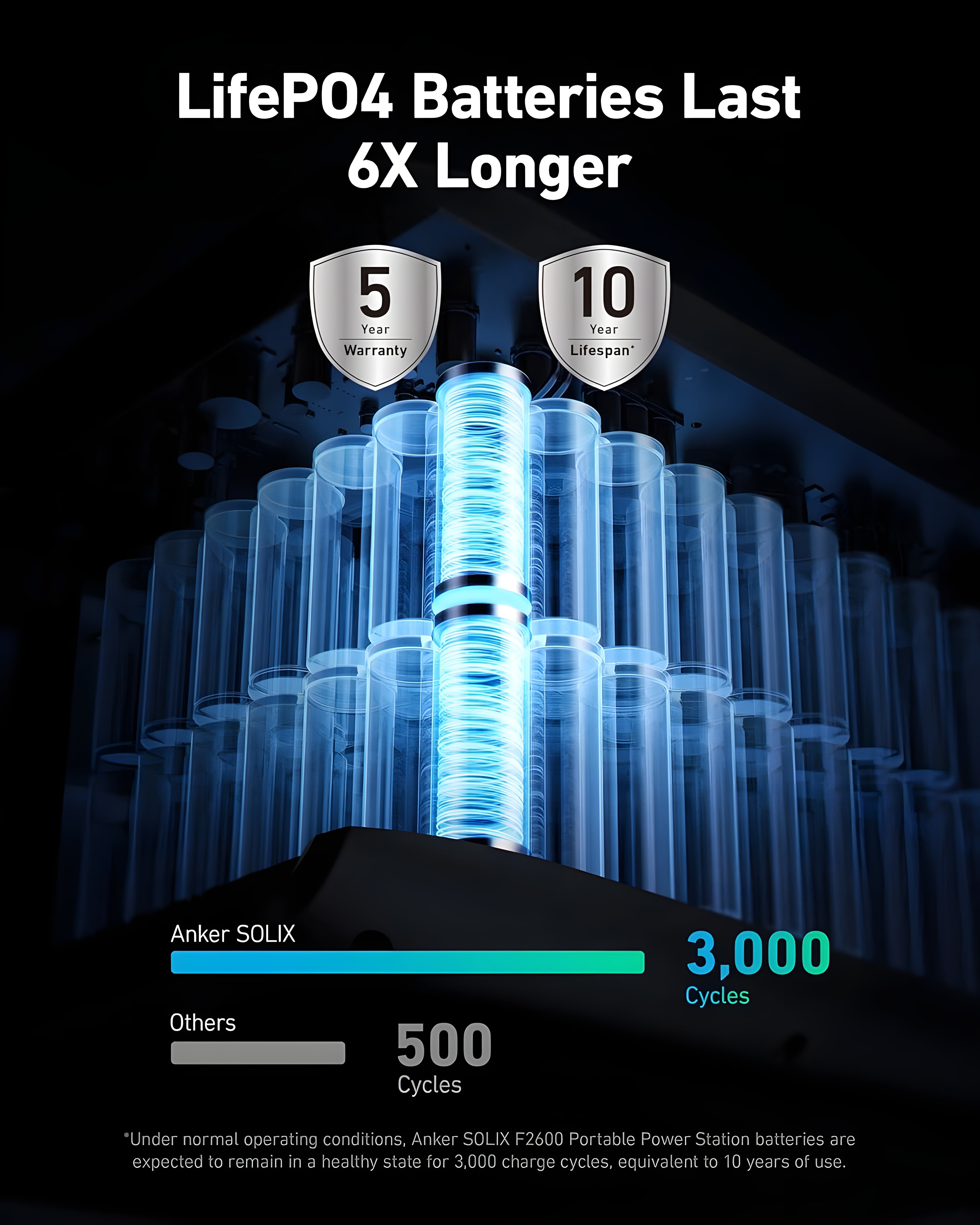 - InfiniPower Durability: The Anker SOLIX F2600 is built to last. It comes with LiFePO4 batteries, smart temperature control, industrial-grade components, and an impact-resistant design. Designed for a 10 year lifespan, backed by a 5-year warranty.