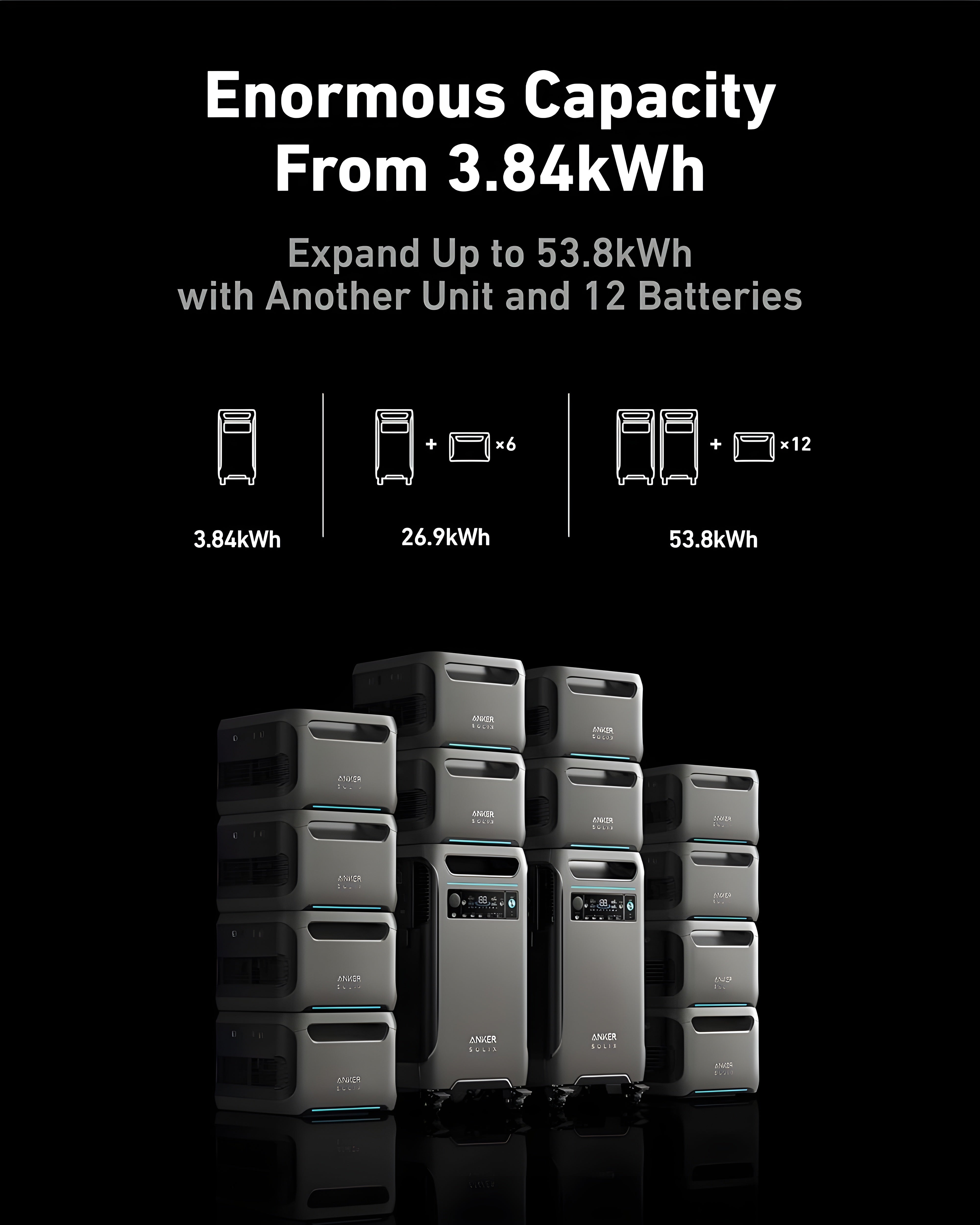 - Enormous Capacity From 3.84kWh: Expand your SOLIX F3800 power station capacity from 3.84kWh up to 26.9kWh with six BP3800 expansion batteries. Expand up to 53.8kWH with two F3800 units and 12 batteries.