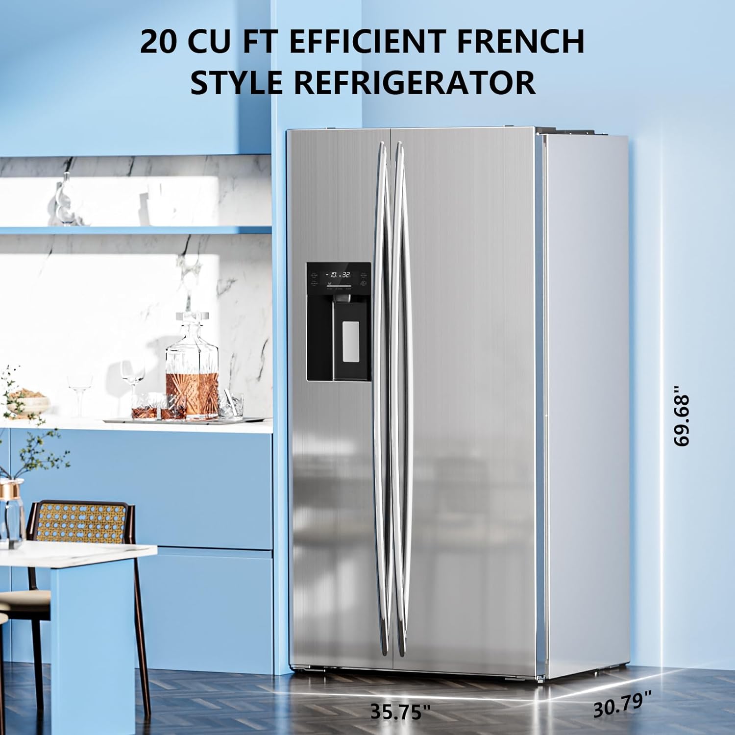 • Large capacity and modern design: This French door refrigerator 30.79"D x 35.75"W x 69.68"H, with freezing area on the left and refrigerator area on the right, different storage structures and large storage enough to suit the various needs of the home