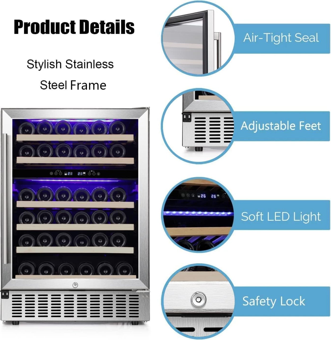 A: Includes a double-pane glass door, soft blue LED lighting, and a sleek black stainless steel finish for a modern aesthetic.