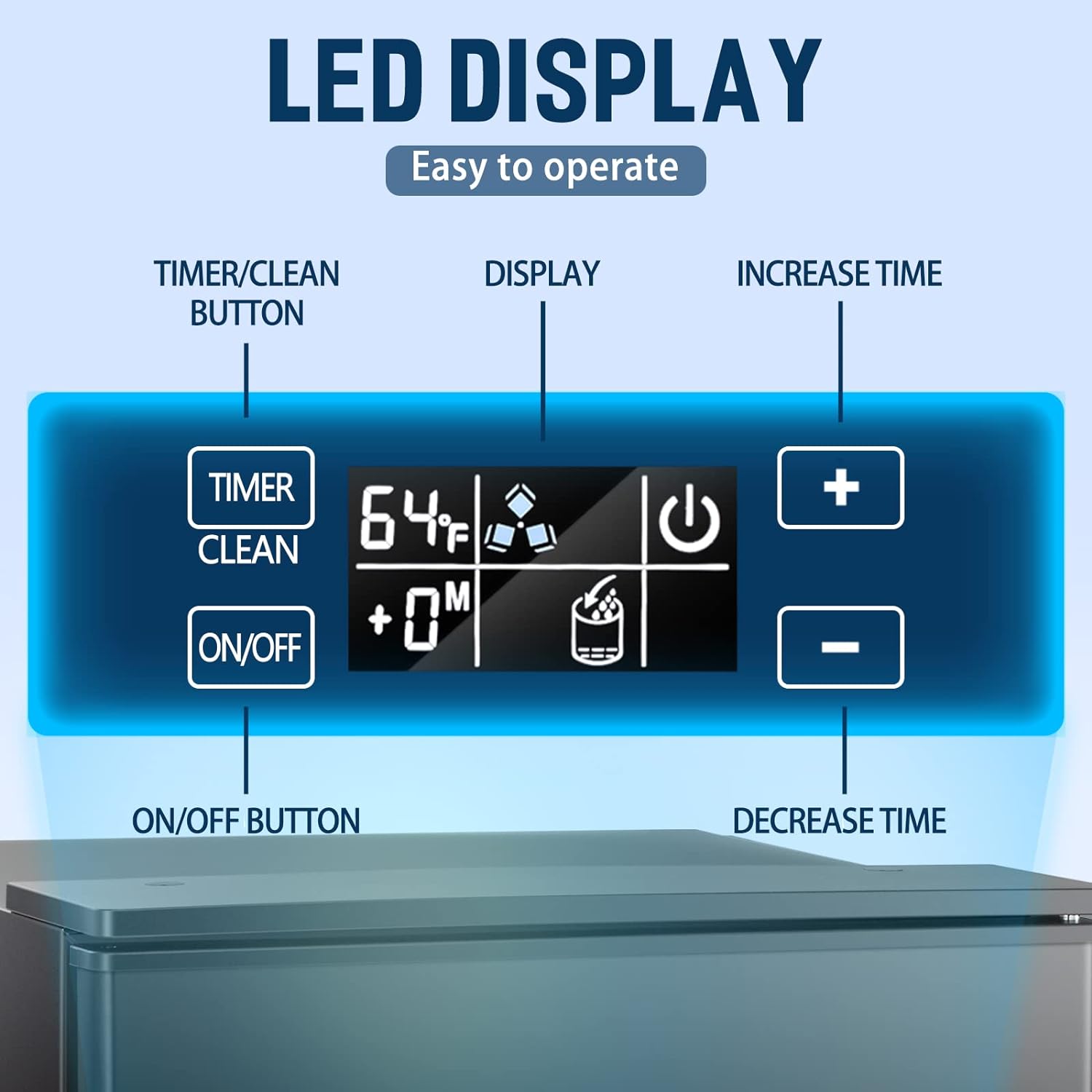 - 【Automatic Cleaning & Timer】The ice maker will produce some dirt inside after long time use, which is troublesome to clear, so we thoughtfully designed the automatic cleaning function. In order to ensure the normal and clean use of the ice machine, you need to turn on this function regularly to clean the ice machine. In addition, we also designed a timer, you can set the timer through the control panel.