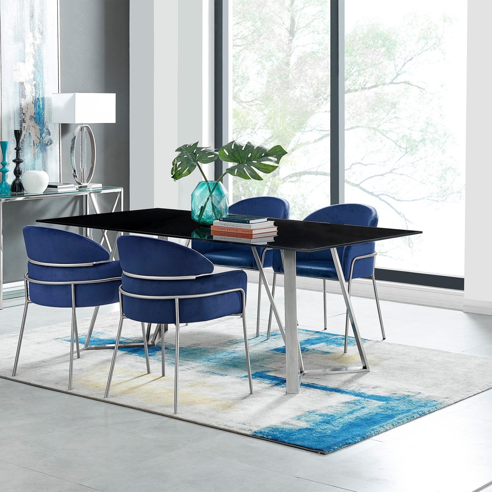 A: The set includes a sleek rectangular dining table with a black tempered-glass top and a stainless steel frame, along with four stylish dining chairs upholstered in blue fabric.