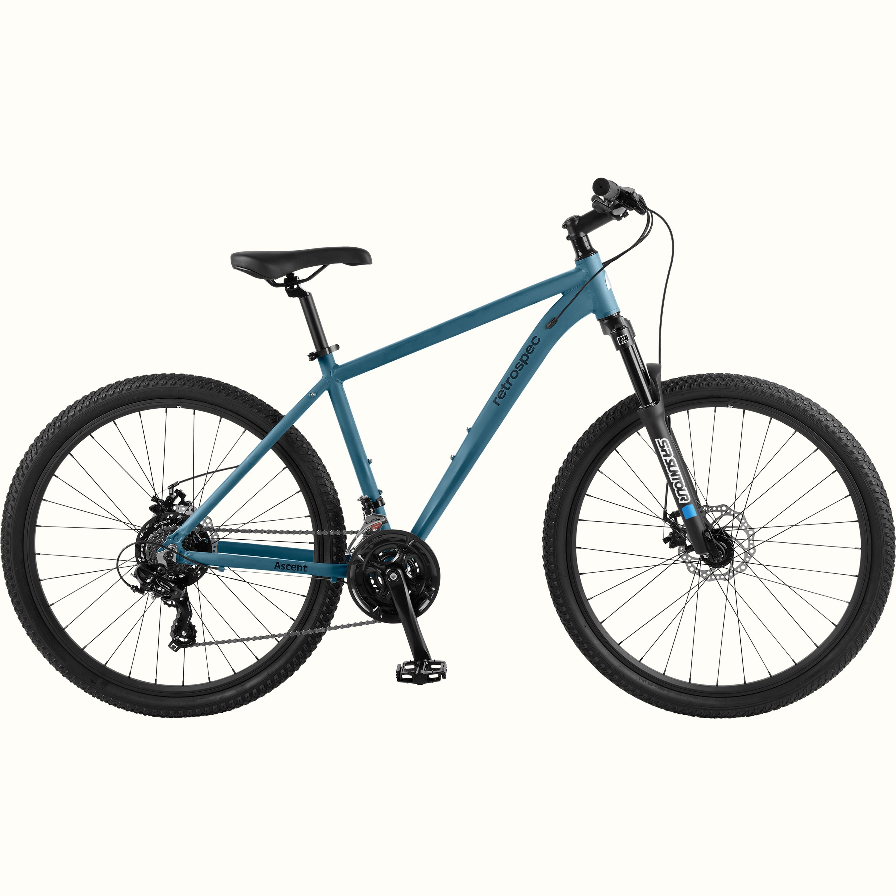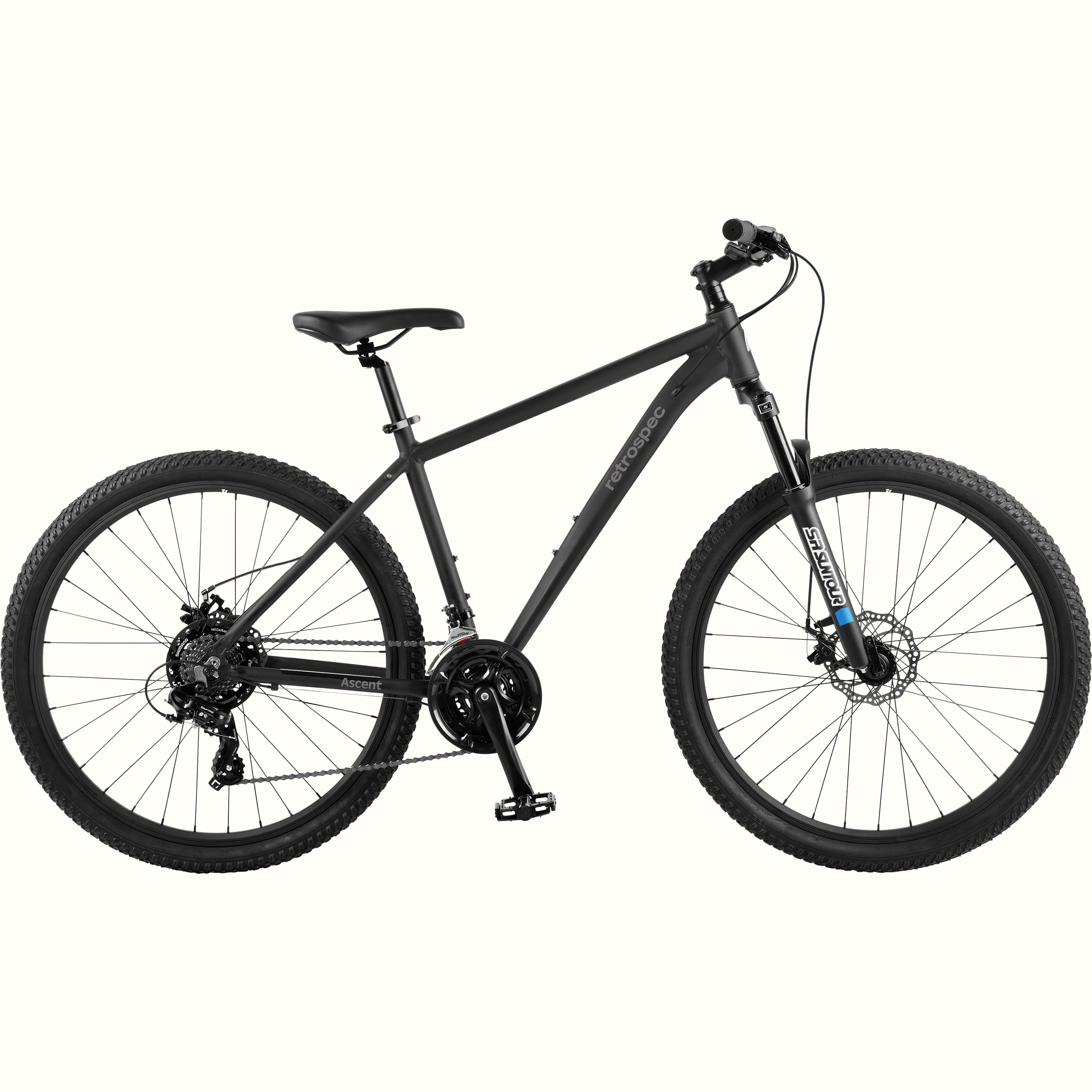 A: The Retrospec Ascent 27.5" Mountain Bike comes in frame sizes ranging from 16" to 20", suitable for riders between 5'0" and 6'4" tall. Available colors include Matte Black, Matte Silt, and Matte Superior Blue, allowing you to choose one that fits your personal style.