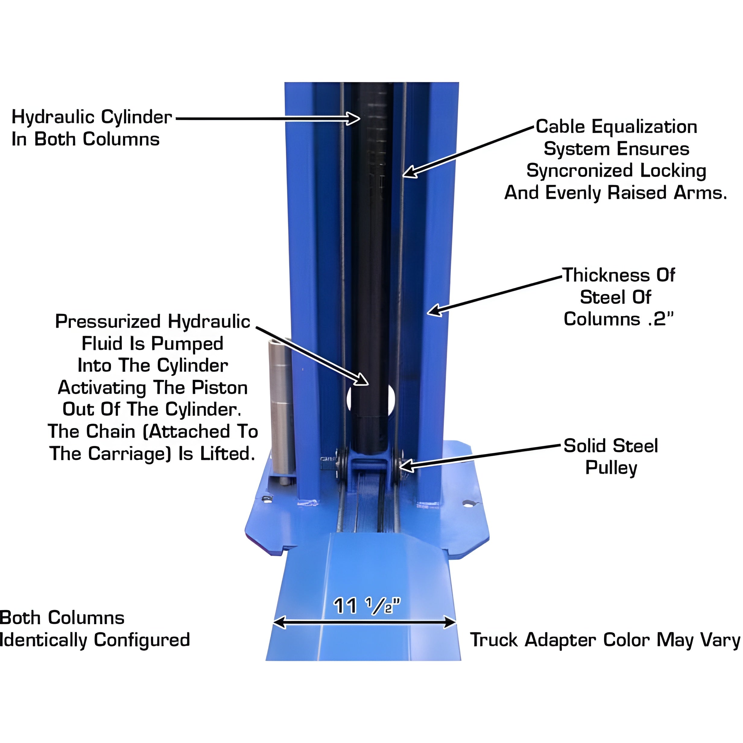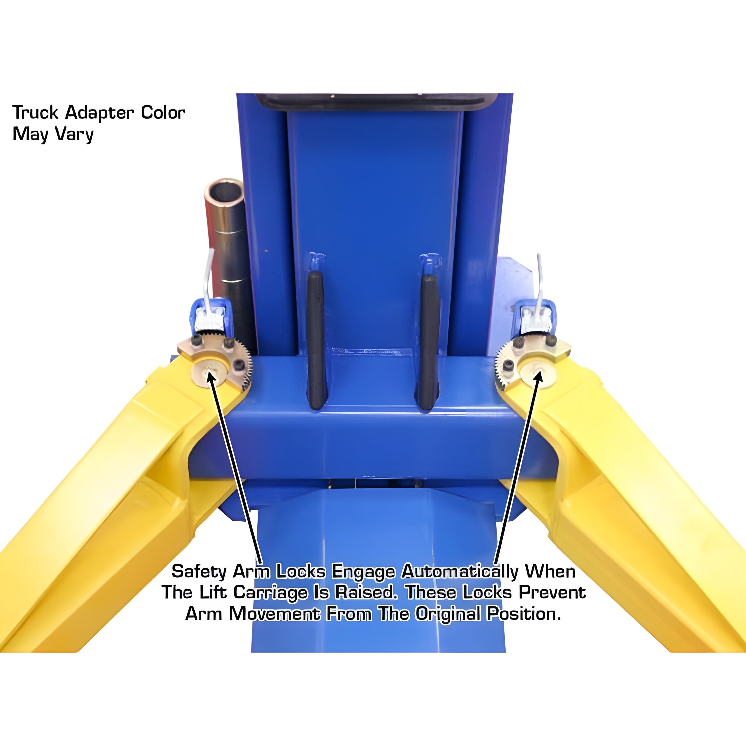 The Atlas BP8000 is a baseplate two-post lift designed for low ceiling garages. The total column height of 108 inches or 9 feet allows this lift to be installed in almost any professional or home garage with a ceiling as low as 9 foot 3 inches. The BP8000 also has many of the popular features found on larger more expensive lifts, including a single-point lock release, Super-symmetric arms, and a twelve piece truck adapter set. This combo includes the Atlas Lawn Mower Adapter or LMA. The LMA allows the 2-Post lift to better raise ATV’s, UTV’s, and lawn mowers. The LMA is adjustable along the length of the lifts arms to handle different wheelbase vehicles. The weight capacity of the LMA is dependent on the positioning of the adapter (higher when the plates are closer to the columns) and the balance of the weight of the vehicle being lifted.
