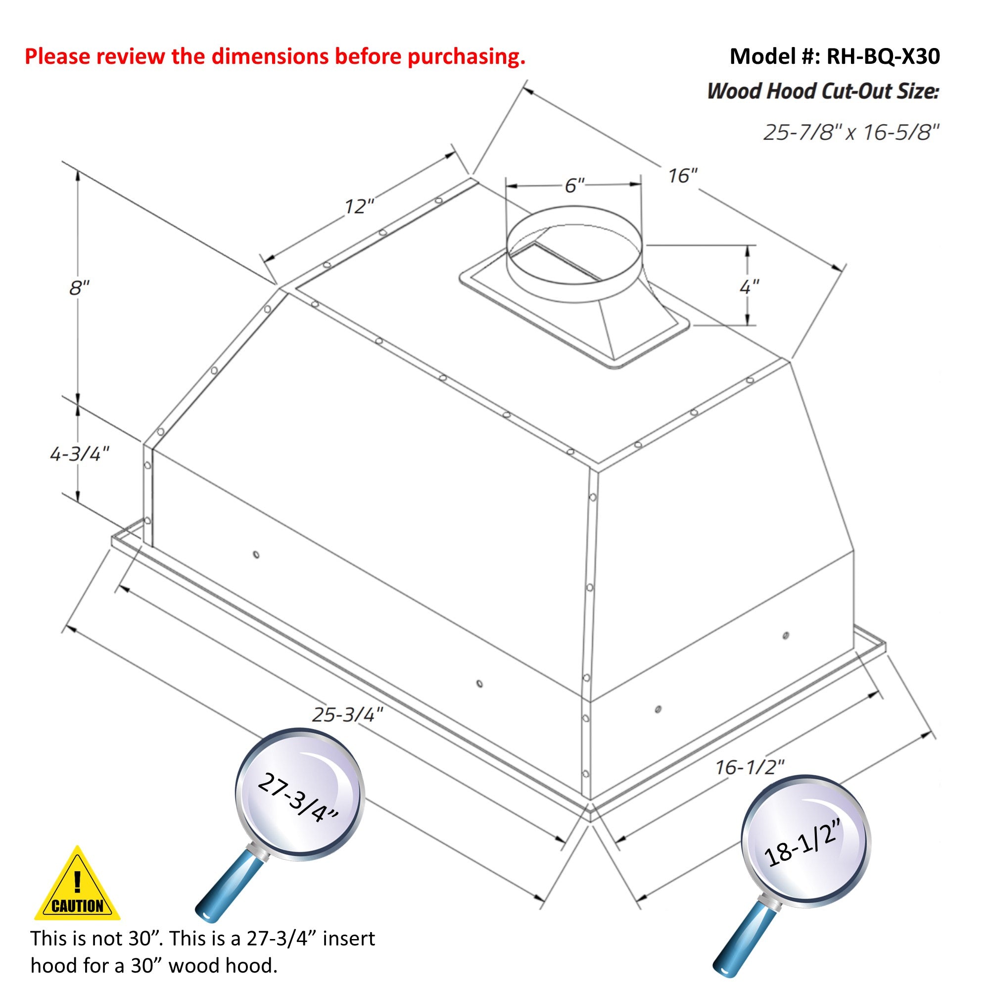- 30" Hood Dimensions: 27-3/4"W x 18-1/2"D x 17-1/4"H. Hood weight: 37 lbs. Wood hood cut out hole size: 25-7/8" x 16-5/8".