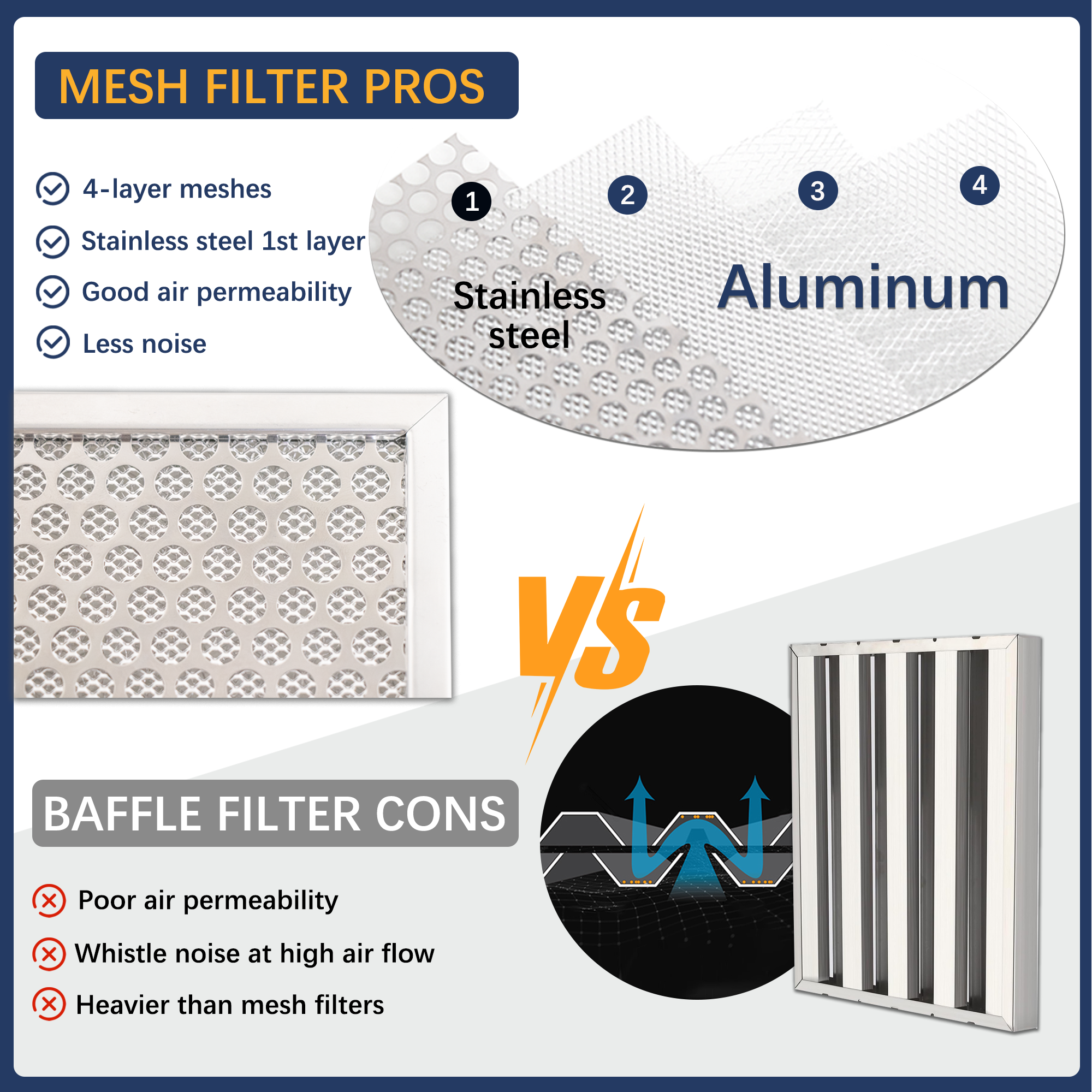 • DISHWASHER SAFE MESH FILTERS: 4 layers dishwasher safe commercial style stainless steel/aluminum mesh filters with built-in latch. Stainless steel for the 1st layer and aluminum for the remaining 3 layers, which provide good air permeability, better suction, and less noise compared to baffle filters. The oil is contained in the mesh filters; no oil holders are needed.