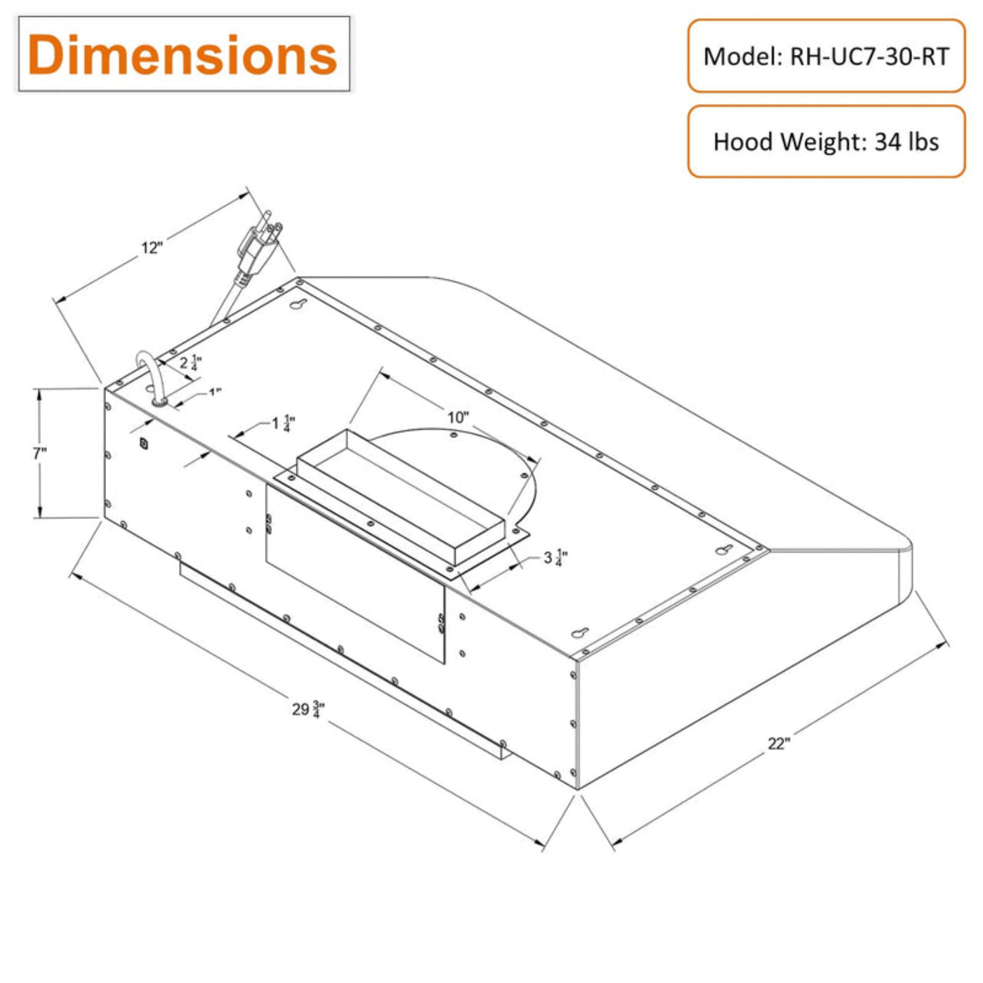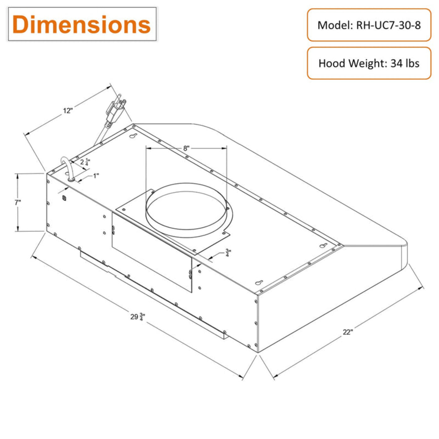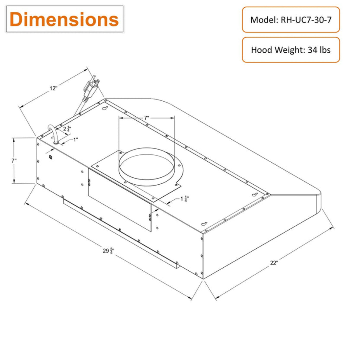 3 Years Limited Parts Warranty: Dimensions: 29-3/4"W x 22"D x 7"H. Hood weight: 34 lbs. ETL Certified. Free parts, repair or exchange within 3 years. Awoco high quality products with a superb reputation and supreme customer service is always a guarantee. Recommended installation height of the range hood is 27”, minimum should be 24” and the maximum should be no more than 30”.