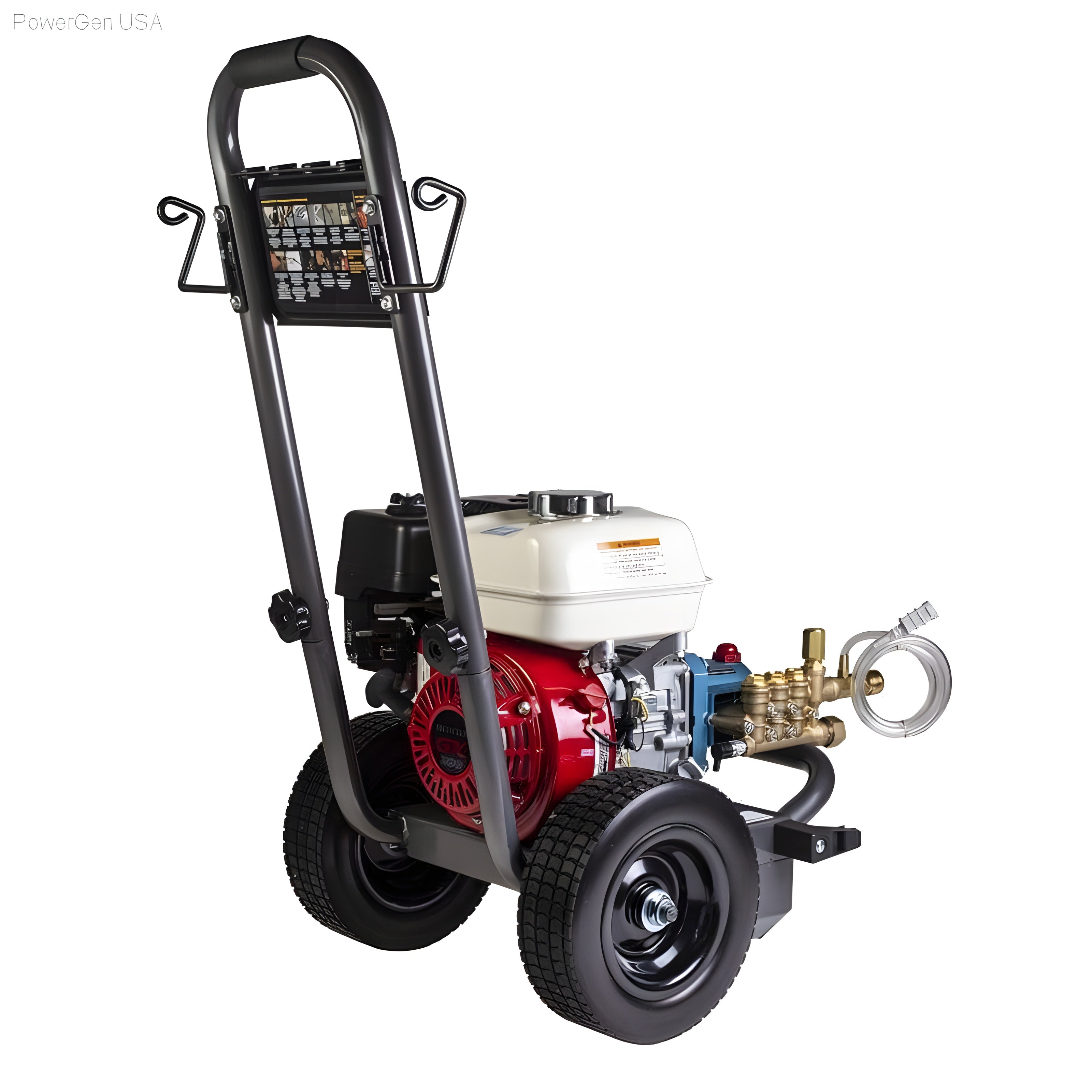 A: This pressure washer is powered by a reliable 200cc engine, providing enough power for effective cleaning without compromising on portability and ease of use.