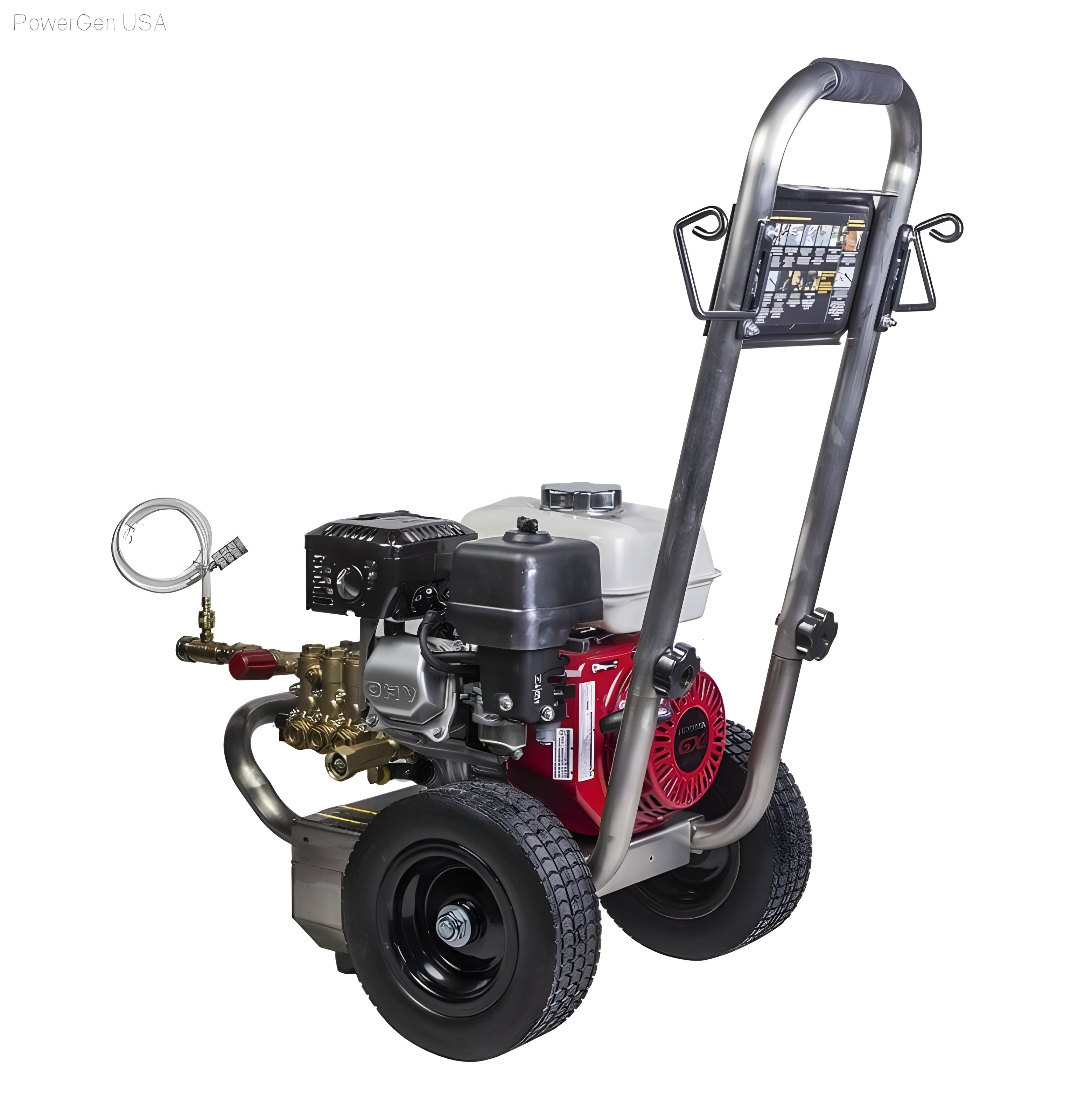 Q: What is the BE Power Equipment 2500 PSI 3.0 GPM Gas Pressure Washer with Honda GX200 Engine and Comet Triplex Pump - PowerGen USA - PE-2565HWSCOMSP?