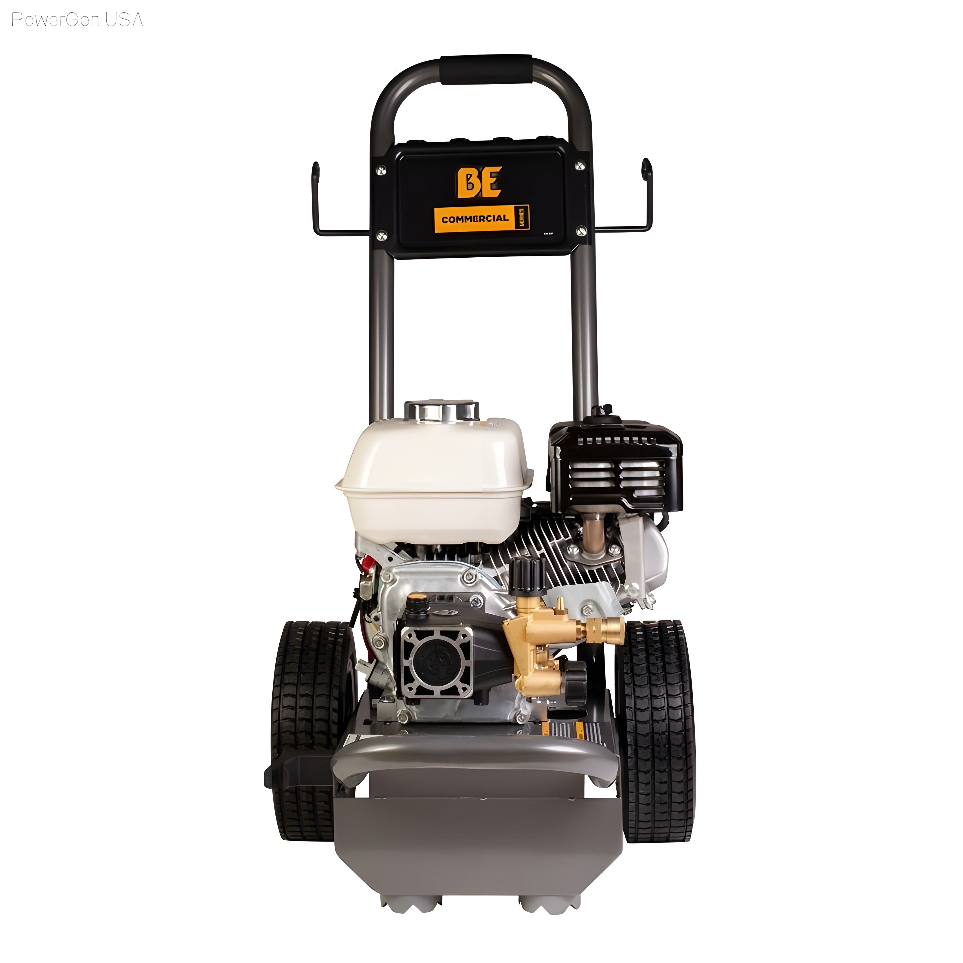 BE Power Equipment Commercial 3,200 PSI 2.8 GPM 200cc Honda GX200 Engine Gas Pressure Washer features a commercial-grade AR triplex pump that delivers 2.8 GPM at 3,200 PSI. Powered by a Honda GX200 Engine, this pressure washer is ideal for contractors who depend on durable and effective equipment. Clean driveways, parking lots, building exteriors, animal pens, paint prep and so much more. Clean up to 270 sq. ft. in fifteen minutes with this cold pressure washer - The Power You Need.