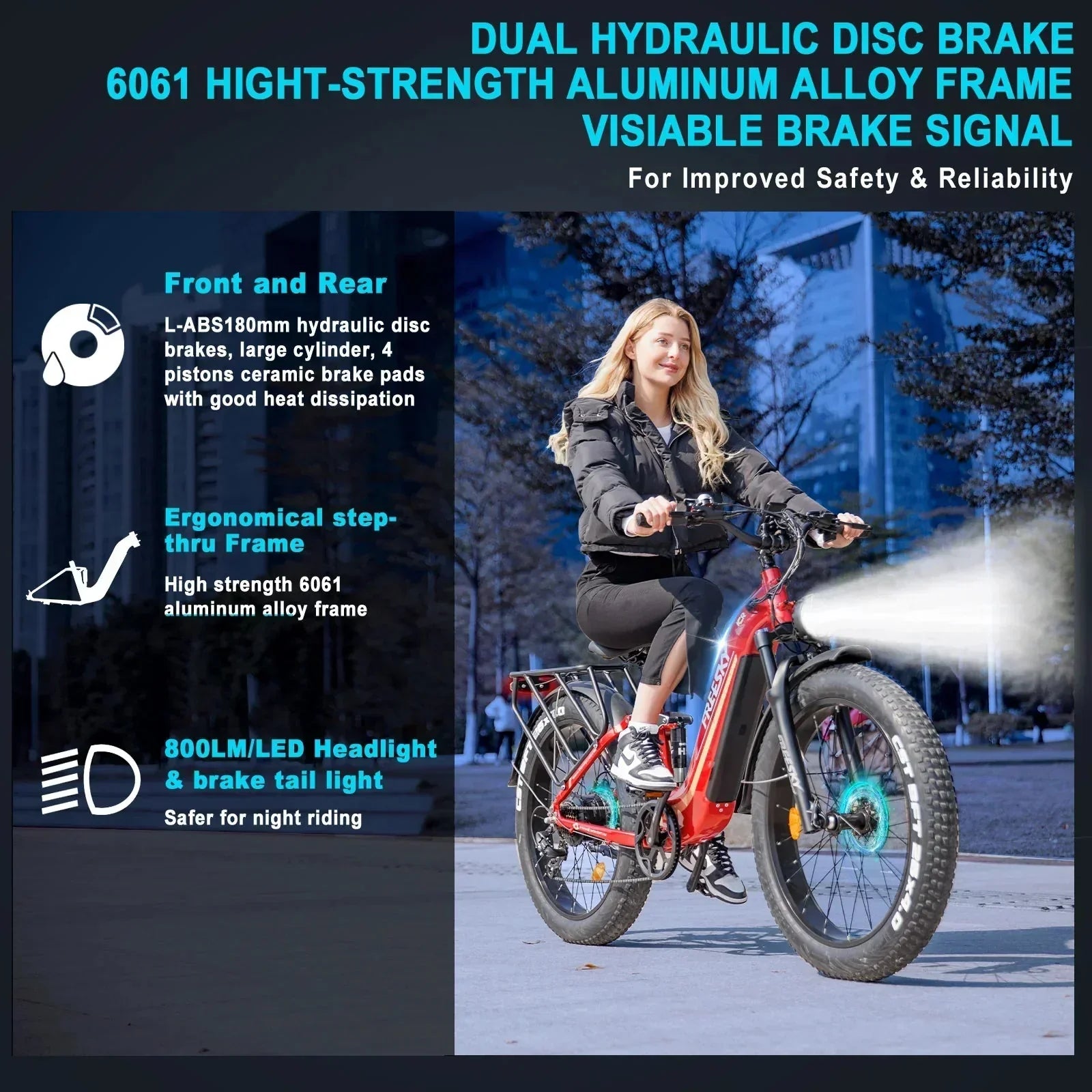 Fat Tires: The 26-inch fat tires are perfect for tackling a wide variety of terrains. Experts tend to recommend fat tires for those who are serious about off-roading or riding in challenging environments like snow, sand, or mud. They provide excellent grip and stability, but they also increase weight and rolling resistance, so it’s important to balance that with your ride style and needs.